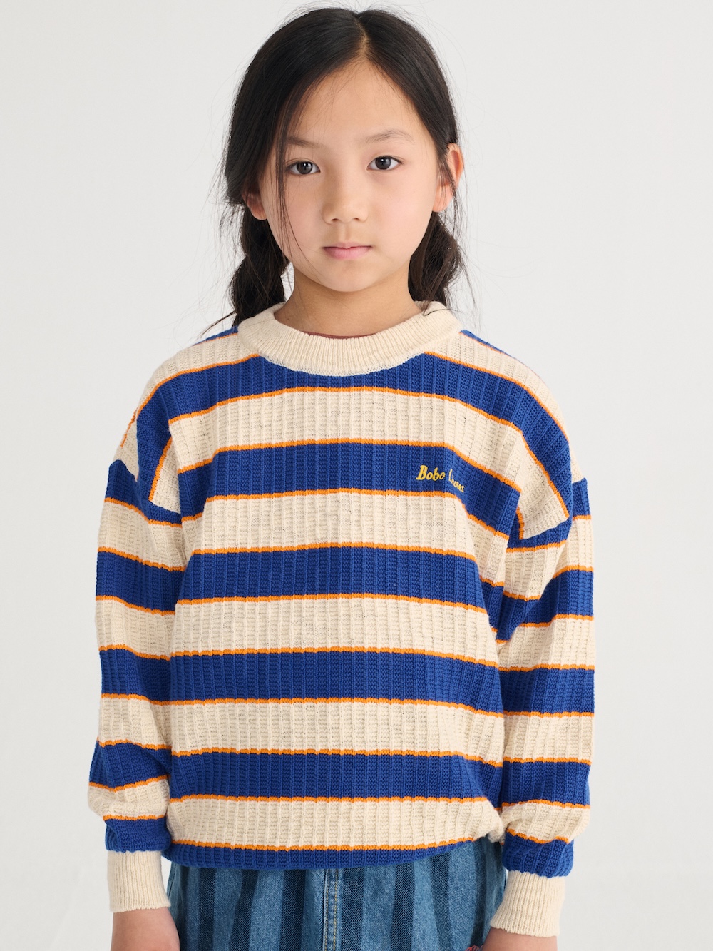 De textuur knit en het gestreepte design geven deze jumper een speelse, typische Bobo Choses look. Afgewerkt met mooie borduursels, een ronde hals en ribboorden bij de mouwen en onderkant. Ideaal om te combineren met een jeans, jogger of over een jurk voor een cozy laagje.