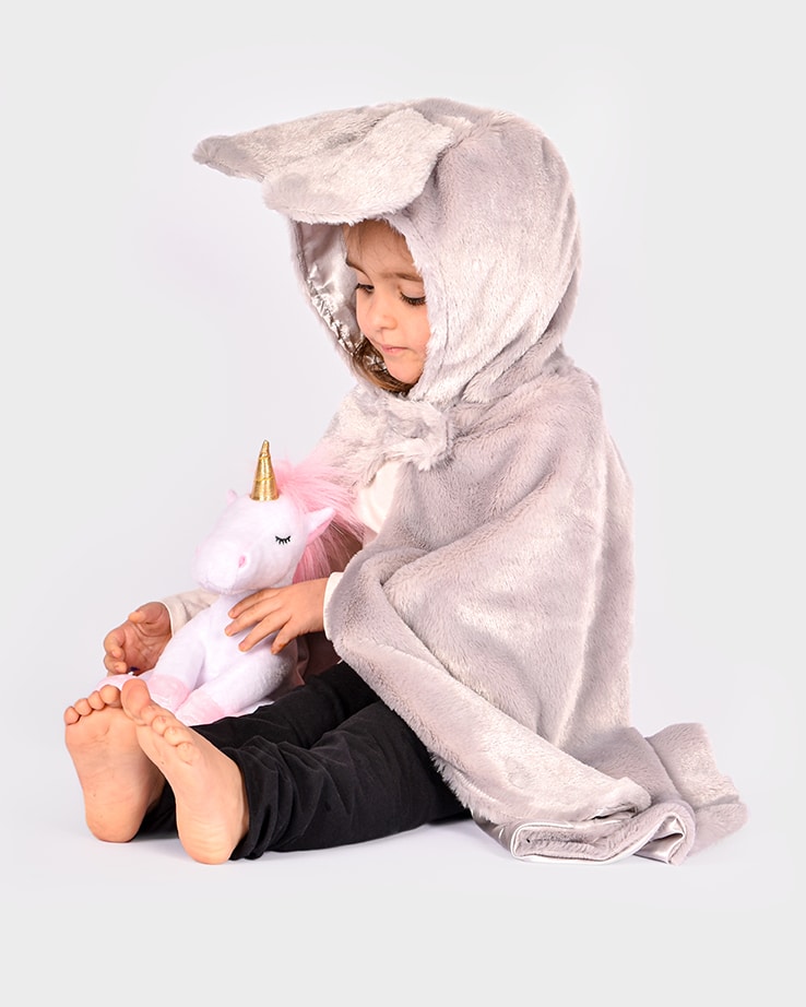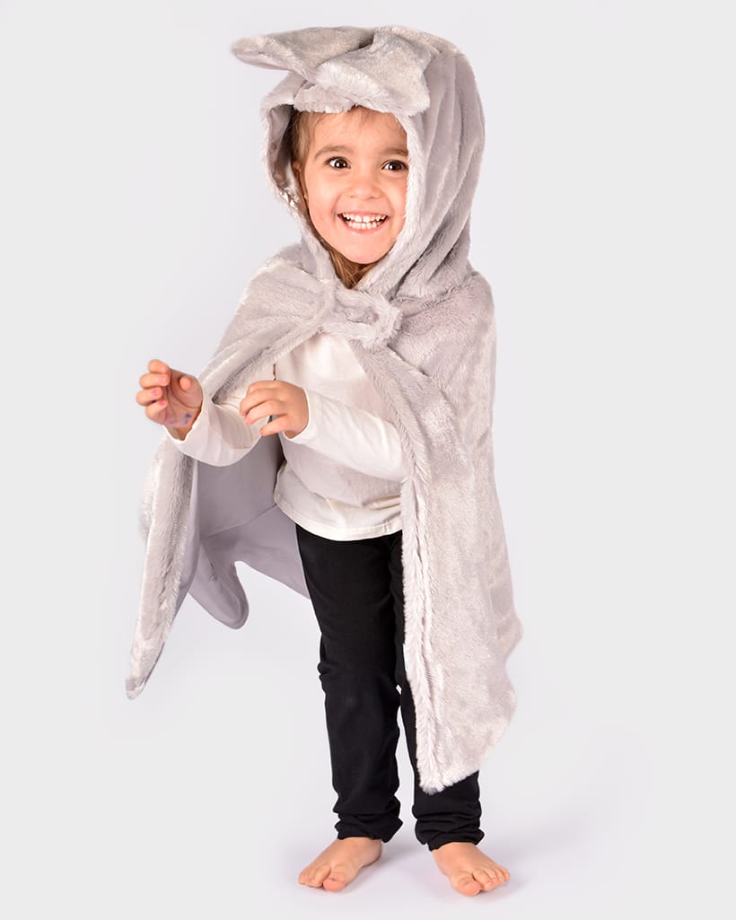 De cape heeft een vaste capuchon met oren, die extra mooi in vorm blijven dankzij een stevige versteviging in de oren. De cape sluit bij de hals met een handige klittenbandsluiting en is gevoerd met een glanzende satijnen voering voor extra comfort en een luxe look.