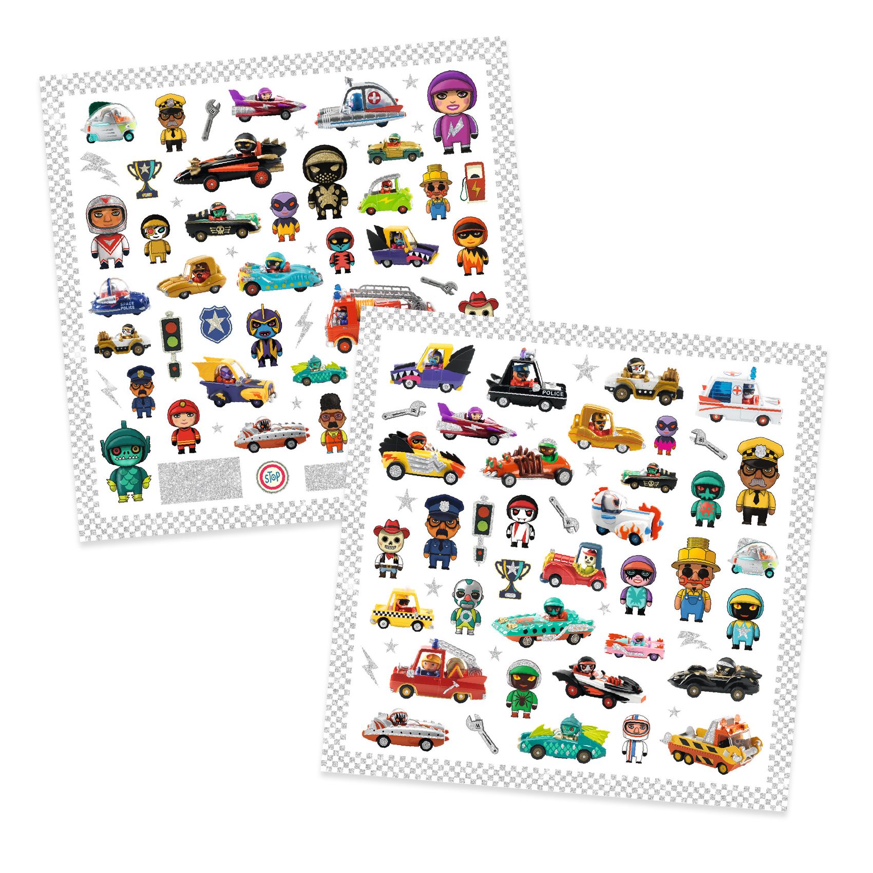 - Metallic zones die de stickers een mooie glans geven. 2 verschillende vellen, elk 2 exemplaren, om je favoriete stickers opnieuw te gebruiken.