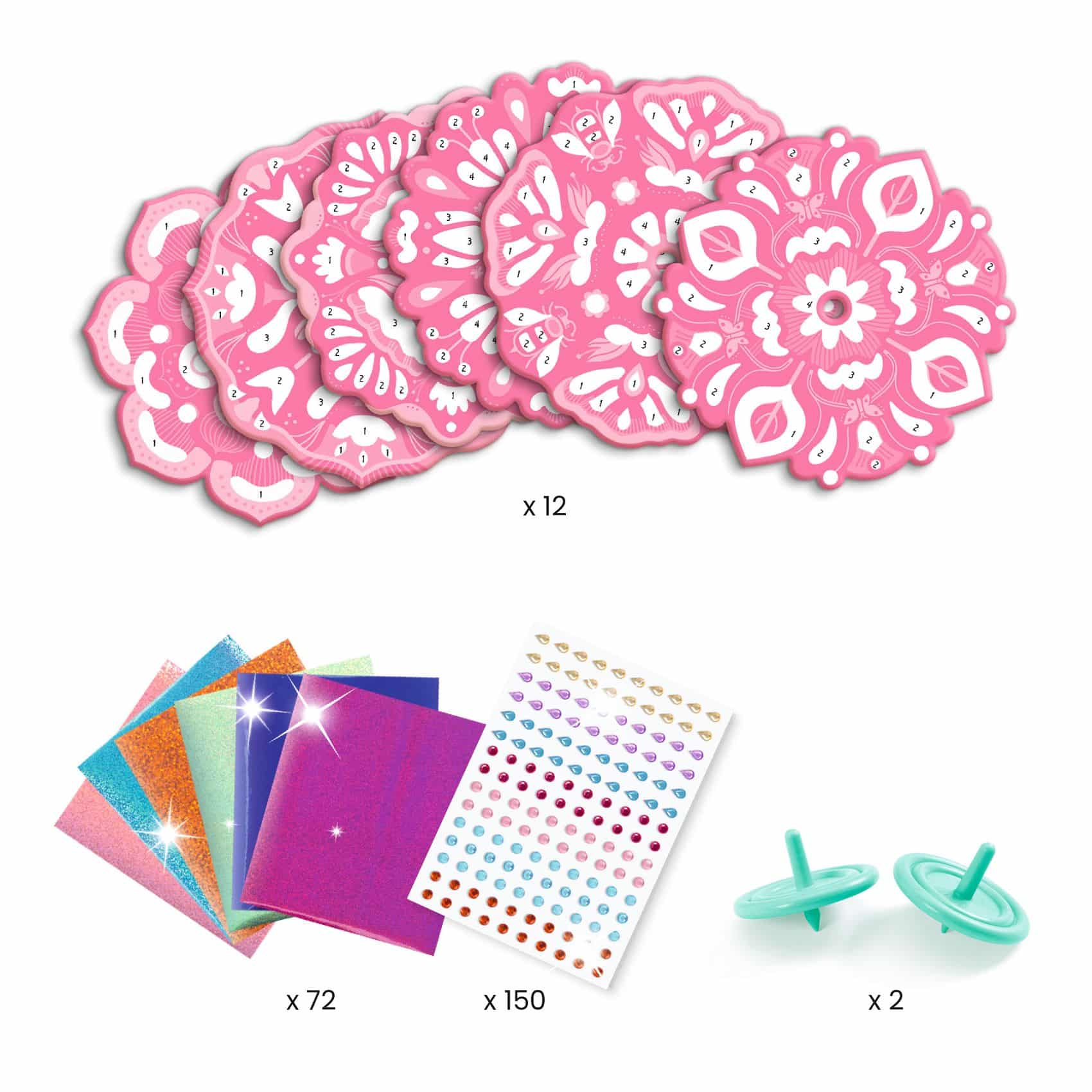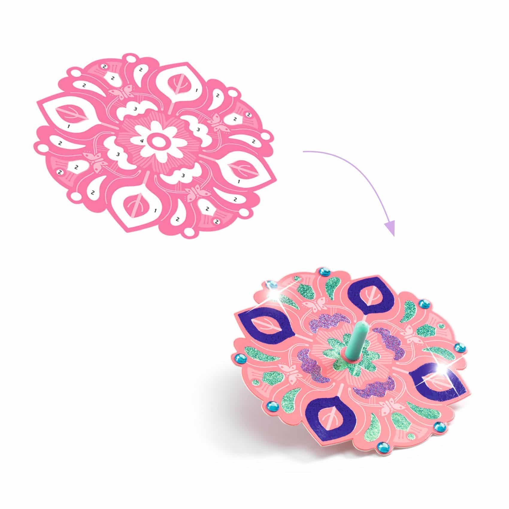 Djeco DIY Bloemenkracht Tollen Maken. Een creatieve set om 12 tolletjes te personaliseren met een “Flower Power”-thema en een schitterende metallic glans. Aan de hand van de kleurcodes op de schijfjes kunnen kinderen de metallic gedeeltes herkennen, de kleeflaag blootleggen en vervolgens de metallic folie aanbrengen. Het materiaal hecht als bij toverslag! Het enige wat nog rest, is hun creaties te versieren met zelfklevende strass-steentjes en de tolletjes te laten draaien om ze te bewonderen, versierd met betoverende metallic glitters!