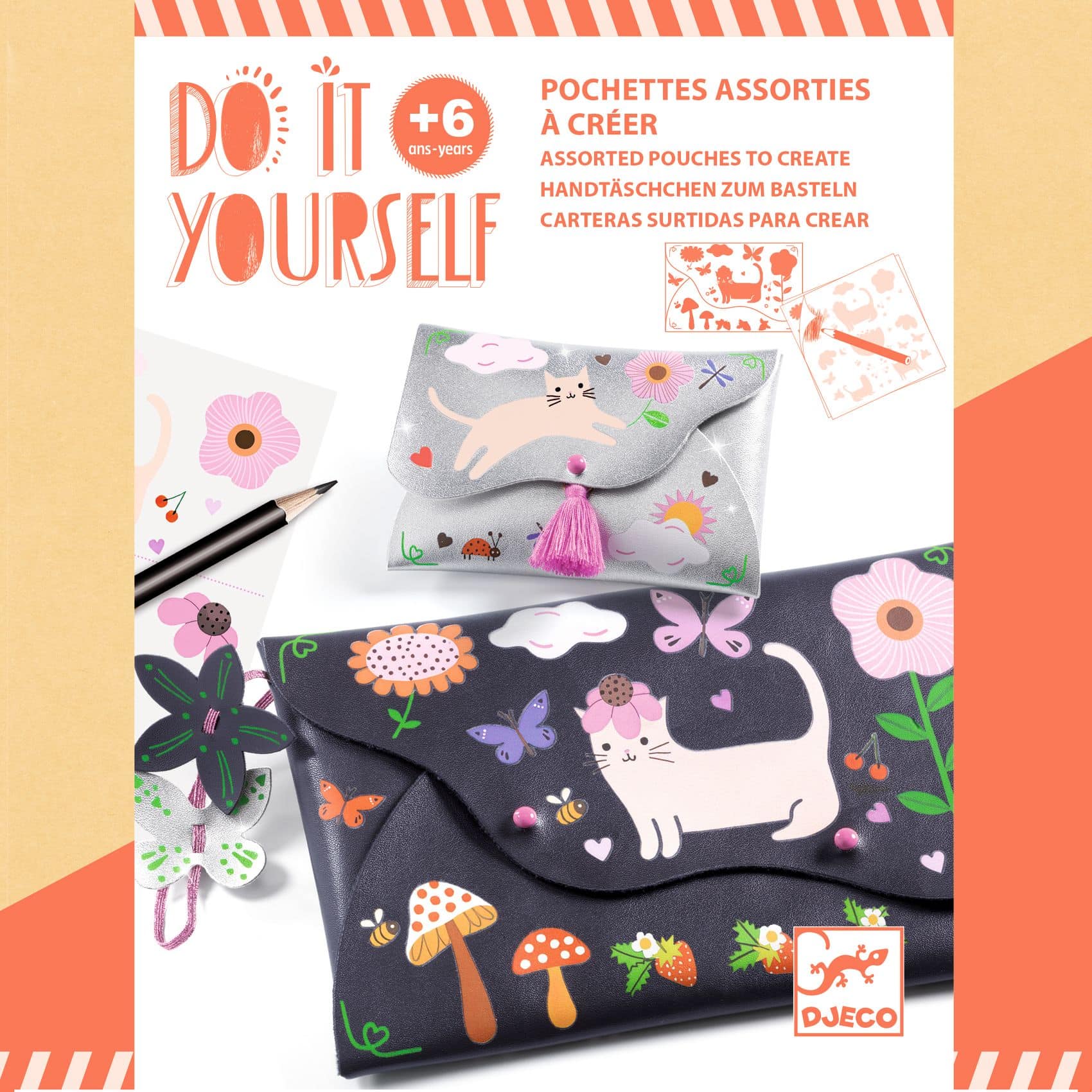 Djeco DIY Gelukkige vrienden. Trendy en chique tasjes die je kunt personaliseren door de voorbeelden te volgen of door je creativiteit de vrije loop te laten. Meer dan 100 stickers om de vakjes mee te versieren. Eenvoudige montage, zonder lijm of schaar, dankzij de voorgesneden onderdelen en het slimme schroefbevestigingssysteem. De gedetailleerde stapsgewijze instructies begeleiden kinderen door elke fase van hun creatie. FSC®-gecertificeerde kartonnen verpakking.
