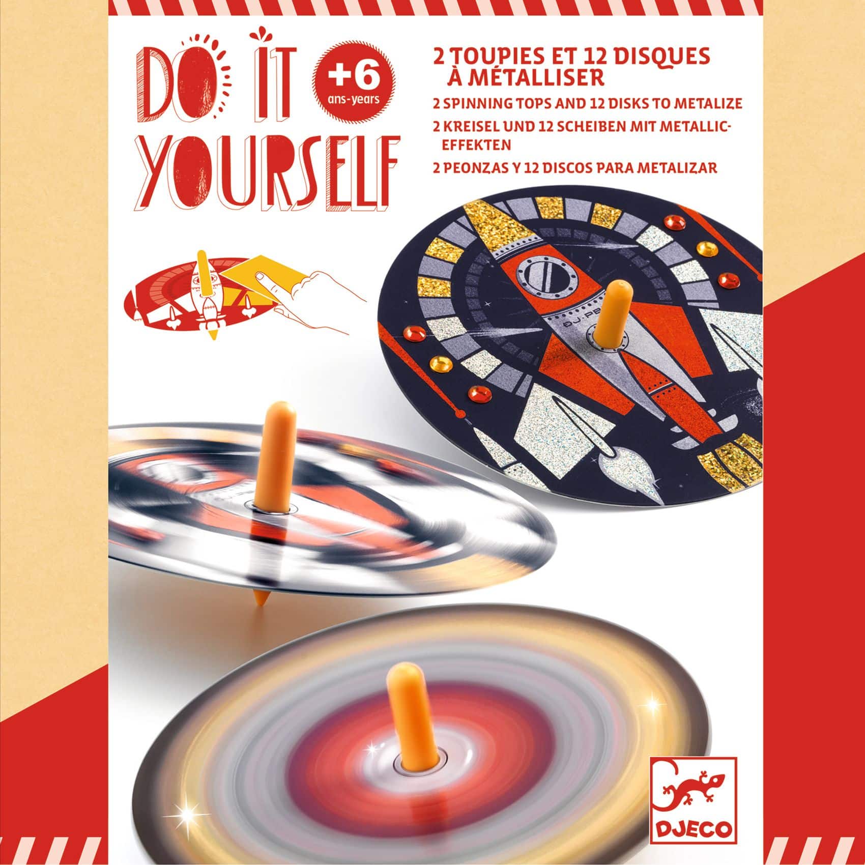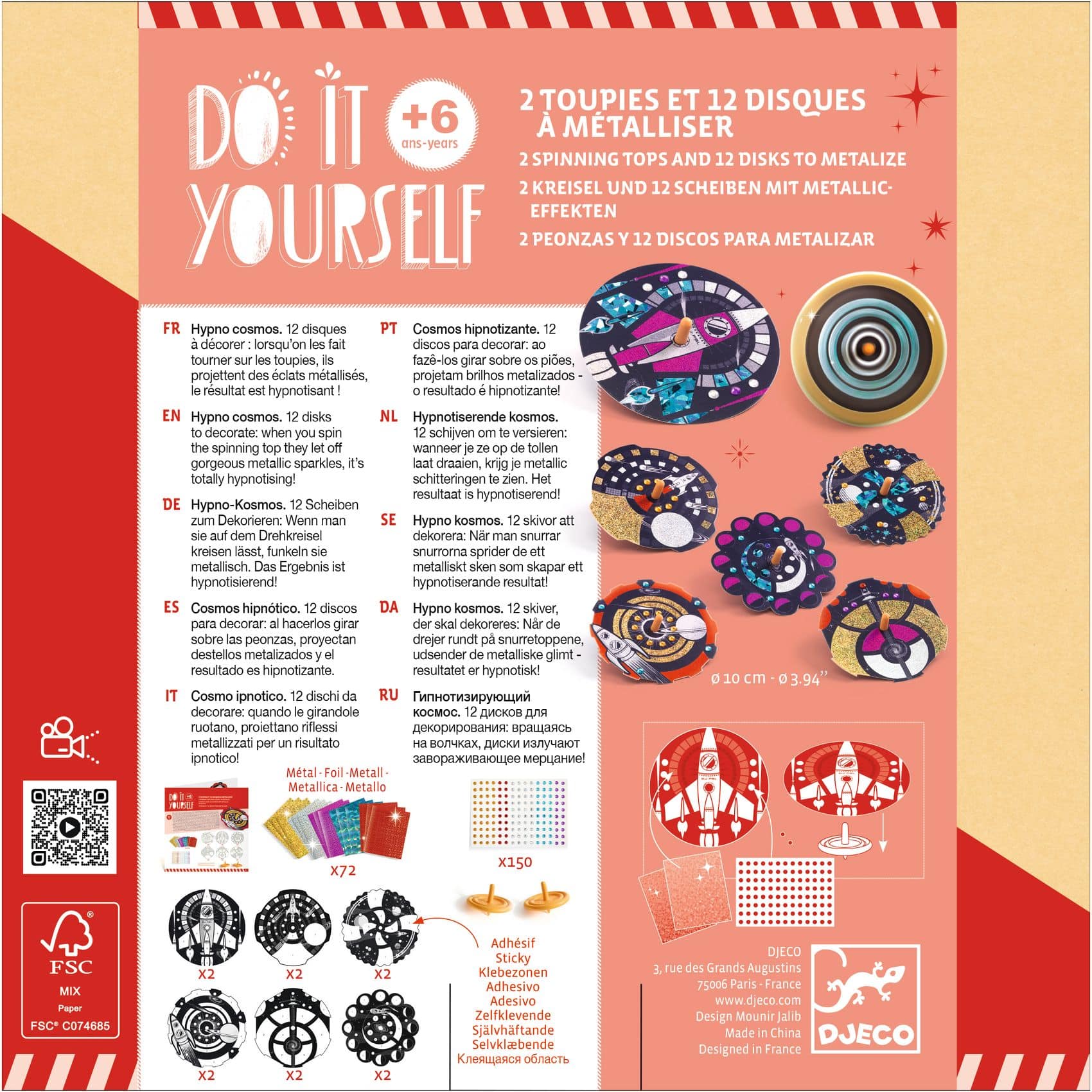 Djeco DIY Hypnocosmos Tollen Maken. Een creatieve set om 12 tolletjes met ruimtethema te personaliseren met een schitterende metallic glans. Aan de hand van de kleurcodes op de schijven kunnen kinderen de metallic gedeeltes herkennen, de kleeflaag blootleggen en vervolgens de metallic folie aanbrengen. Het materiaal hecht als bij toverslag! Het enige wat nog rest, is hun creaties te versieren met zelfklevende strass-steentjes en de tolletjes te laten draaien om ze te bewonderen, versierd met betoverende metallic glitters!