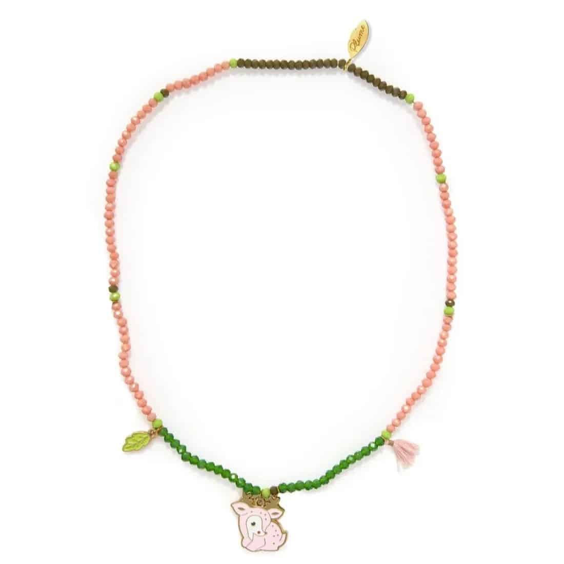 Djeco Ketting Sylvia. Duik in de betoverende wereld van het bos met de Sylvia-ketting. Bestaat uit acryl kralen en drie delicate versieringen: een hindebedeltje, een bladbedeltje van geëmailleerd metaal en een katoenen kwastje. Deze ketting combineert elegantie en verfijning. De dubbele elastische draad zorgt voor optimale stevigheid en maakt het omdoen gemakkelijk, zonder sluiting.
