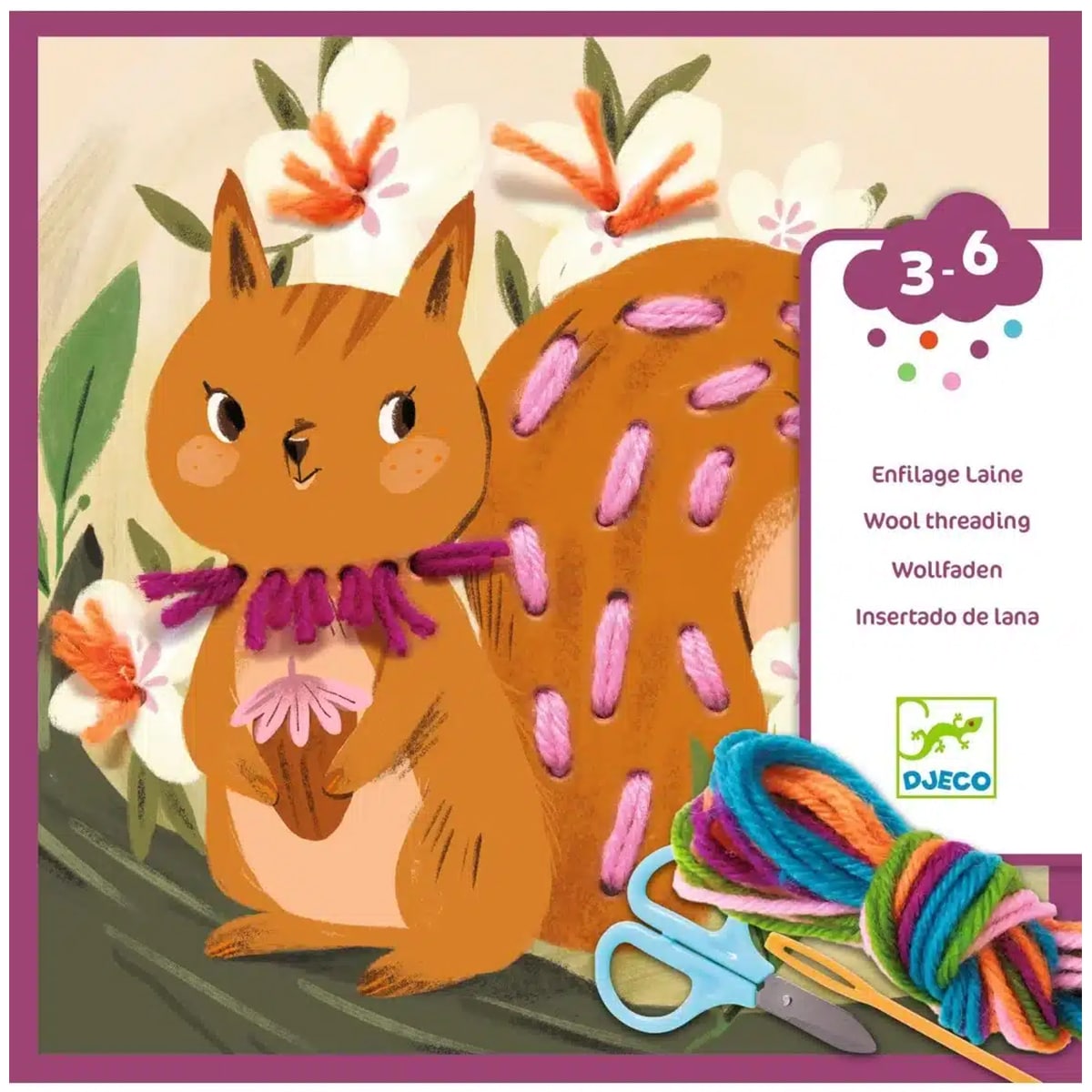 Djeco Knutselset Stap voor stap rijgen met wol. Een eerste inleiding tot borduren! Het kind leert 3 verschillende, doch eenvoudige aspecten van het borduren. 4 schilderijtjes van geborduurde dieren om zijn/haar kamer te decoreren.
