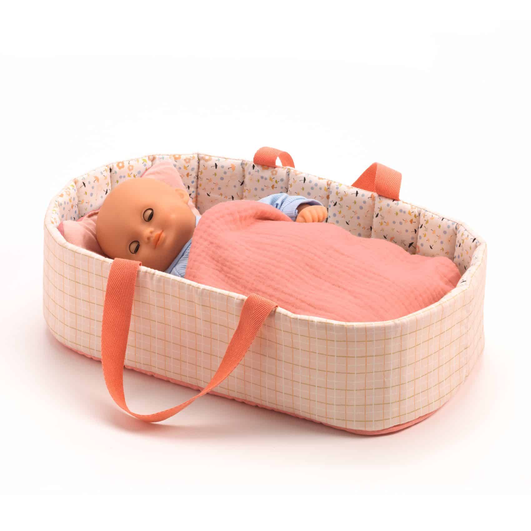 Djeco Poppenwiegje – Pink Lines. Een lichte en praktische wieg met flexibele handvatten om je pop overal mee naartoe te nemen. Een echt knus nest met zijn zachte deken en kussen zodat de baby heerlijk warm slaapt.