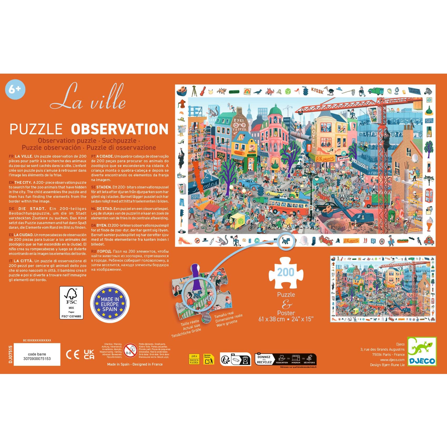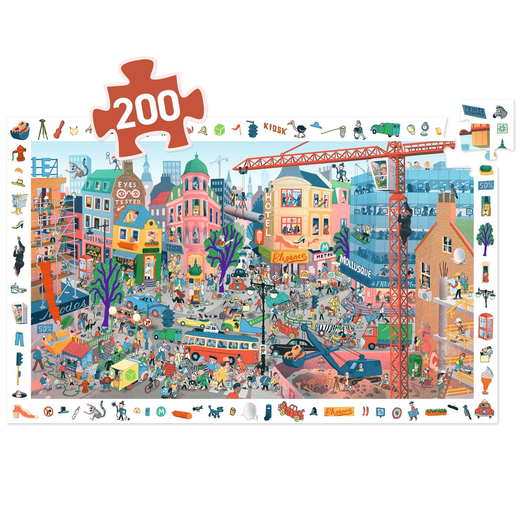 Djeco Puzzel De Stad. Kartonnen puzzel met 200 stukken (61 x 38 cm) + poster. Een puzzel en een observatiespel: de plaatjes in de rand kun je terugvinden in de afbeelding in het midden. Ontdek prachtige werelden door middel van illustraties die rijk zijn aan details en verrassingen. Inclusief een poster ter grootte van de puzzel, die als model dient.