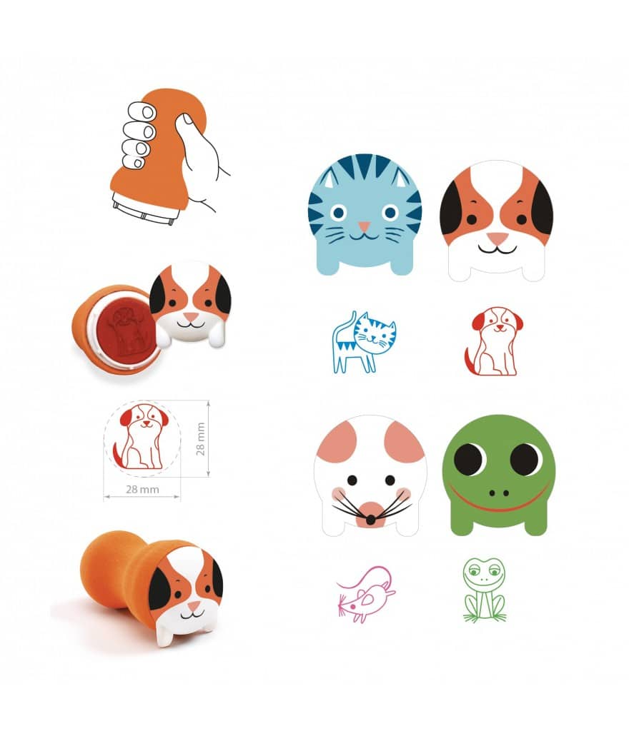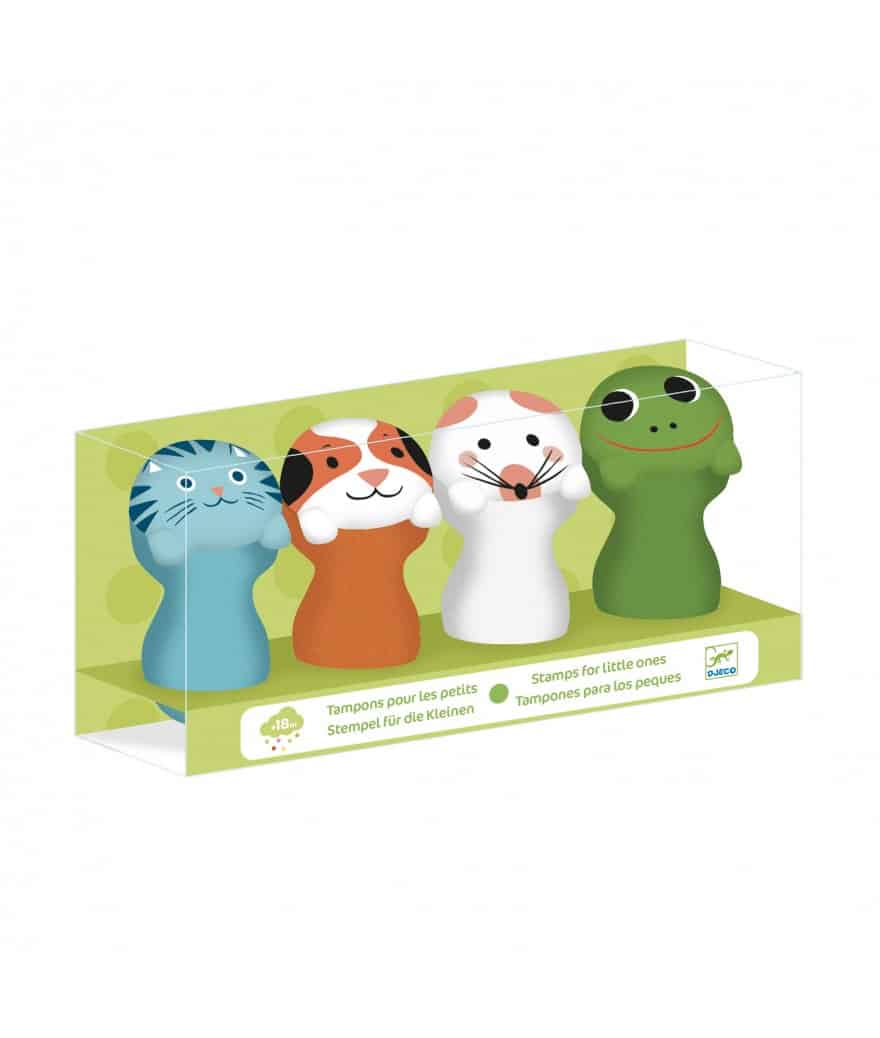 Djeco Stempels Tuin Dieren. 4 ergonomische en zelfbevochtigende stempels ontworpen door Djeco. Een schuimrubberen handvat speciaal voor kleine handen en zelfbevochtigende stempels die goed markeren.