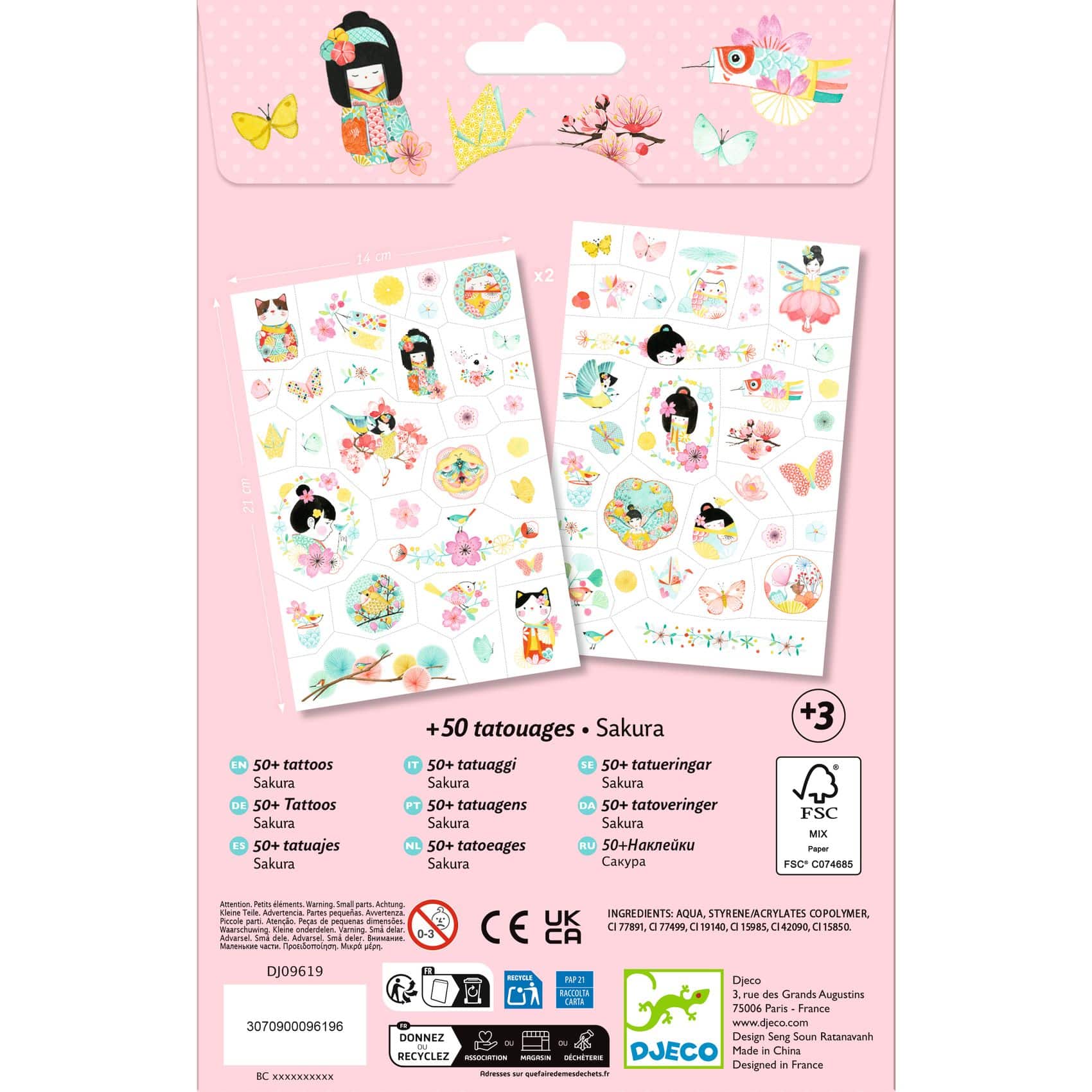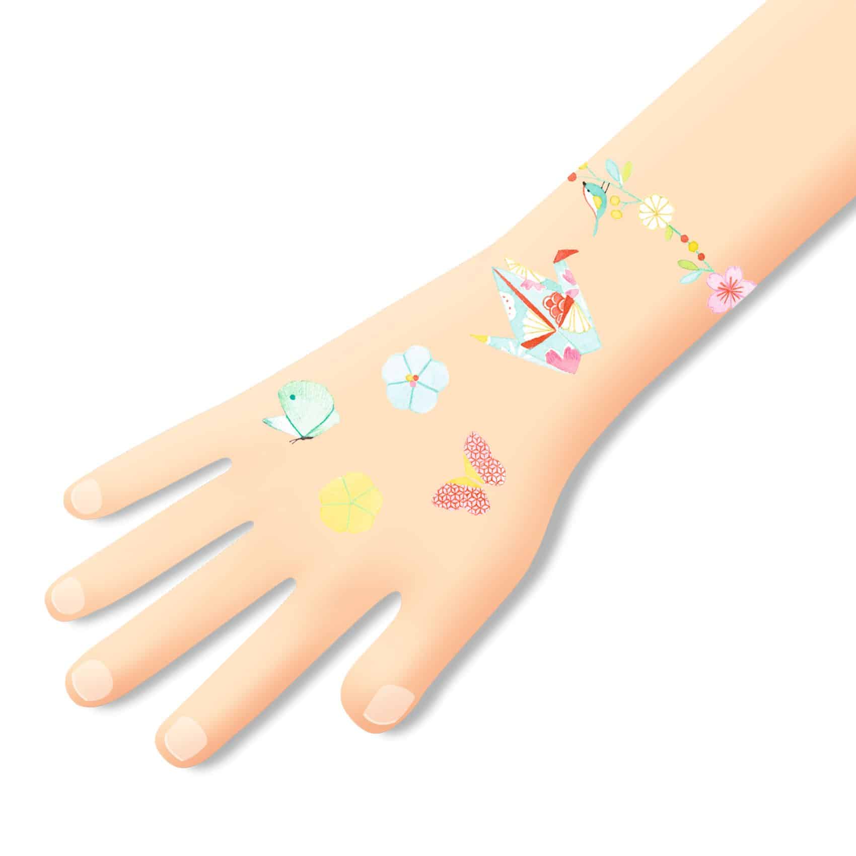 Met deze tijdelijke tattoos Sakura kunnen kinderen zich versieren met zachte en poëtische illustraties geïnspireerd op Japanse kersenbloesems. De tattoos hebben delicate kleuren, net als bloemblaadjes die in een lentebries dwarrelen.