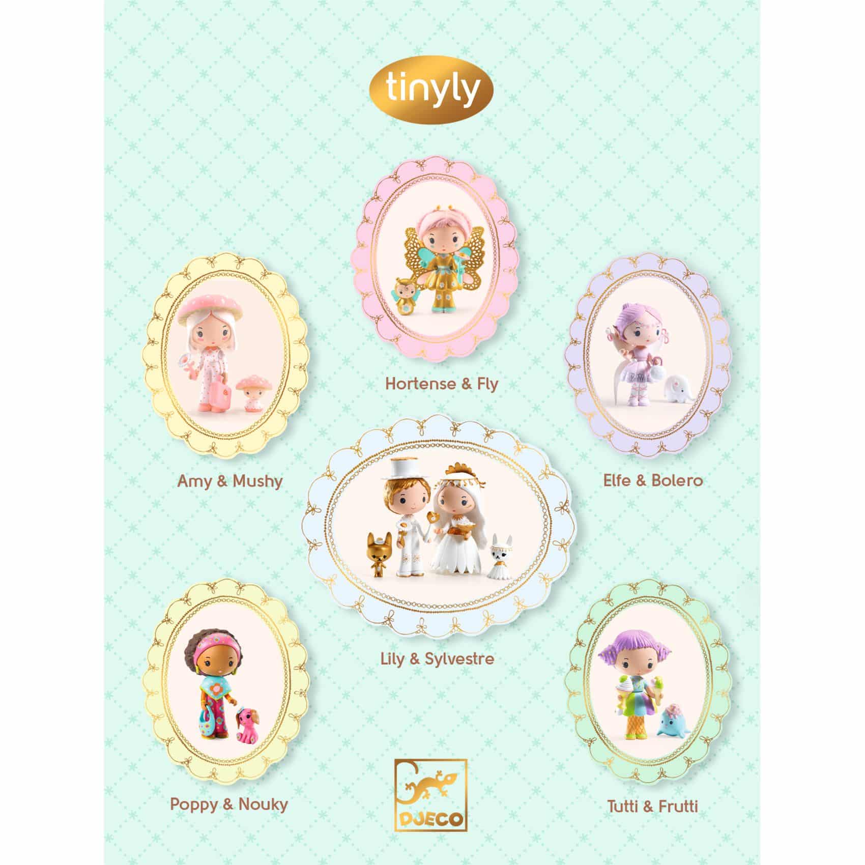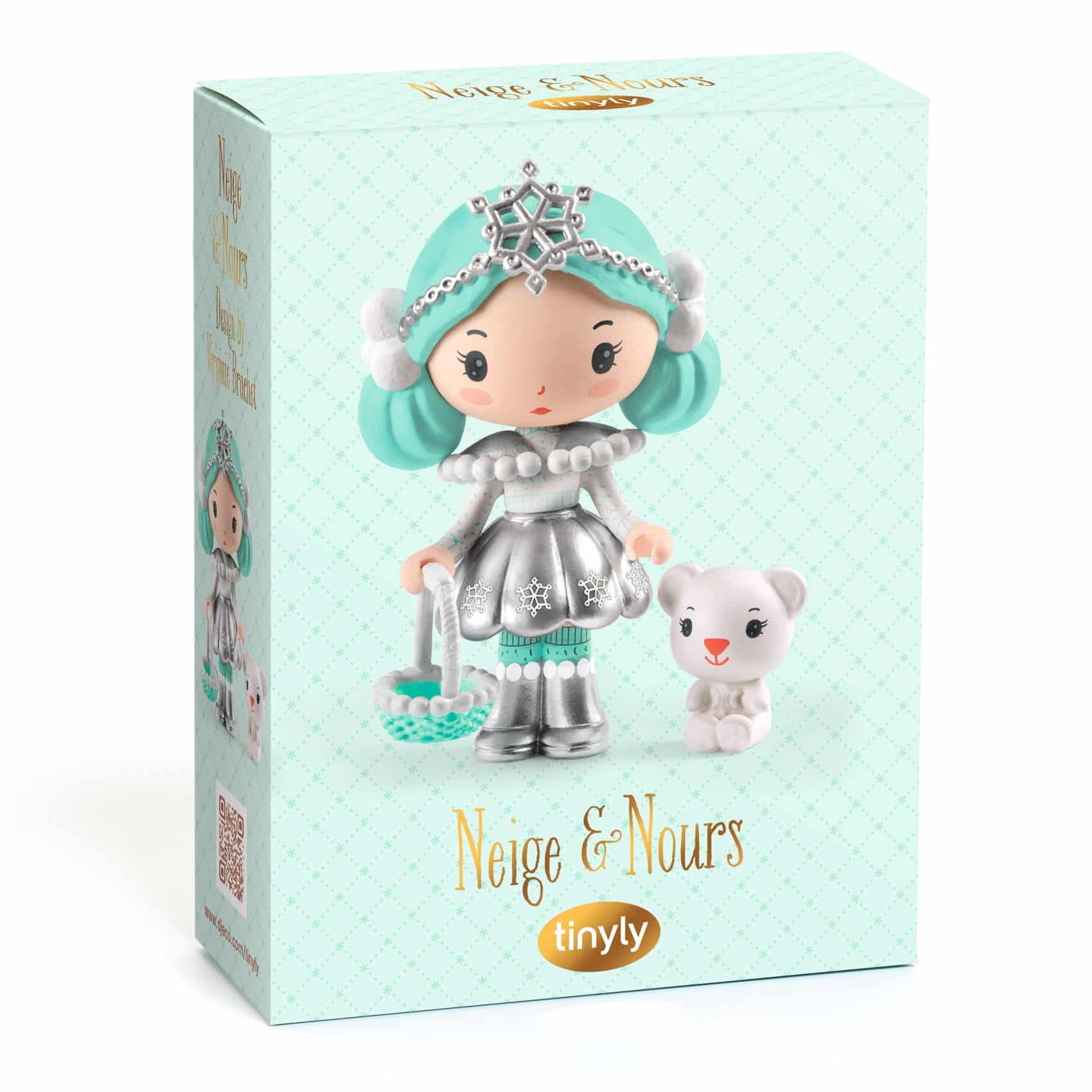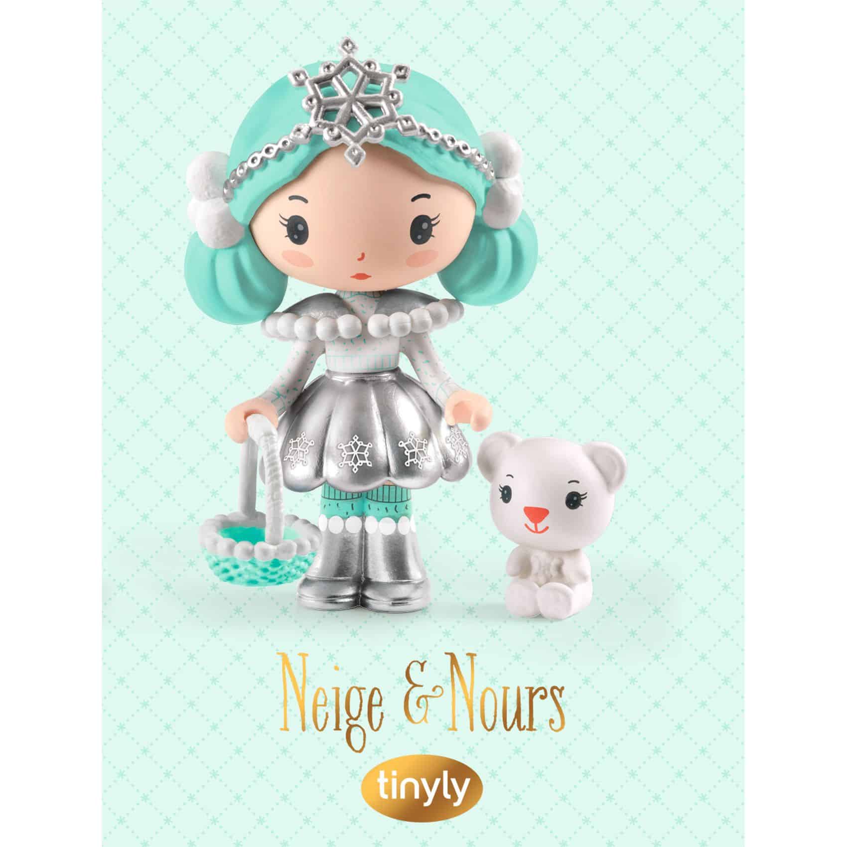 Djeco Tinyly Sneeuw en beren. In de ijzige landen krijg je misschien de kans om Sneeuw te ontmoeten, de ijsprinses met haar zilveren tiara. Met haar schattige mandje in de hand is ze nooit zonder haar trouwe metgezel, Nours, een lief ijsbeerwelpje. Deze wezens, met hun delicate trekjes en zachte kleuren, behoren tot de poëtische wereld van Tinyly. Beeldjes om neer te zetten, te verzamelen of tot leven te brengen in verhalen en fantastische avonturen!