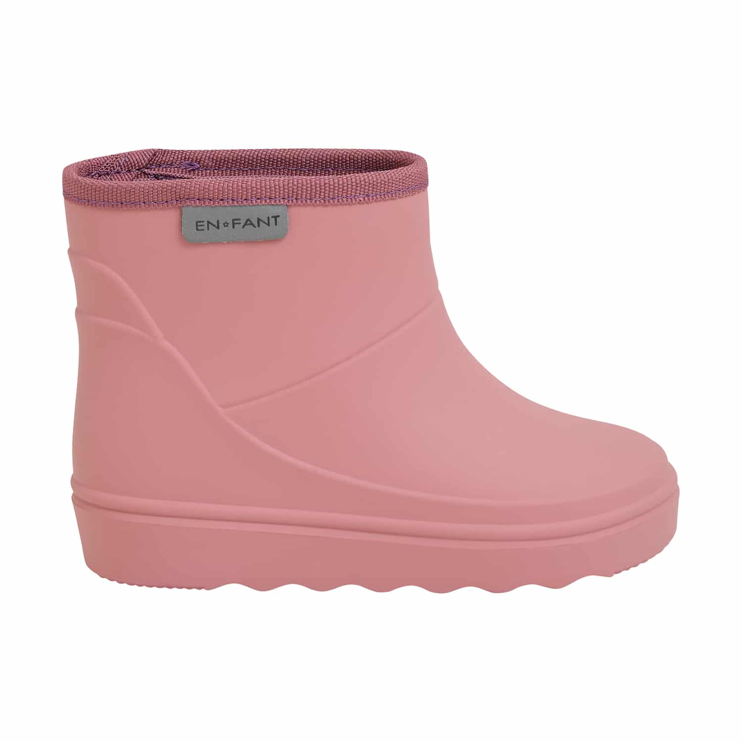 Enfant Rain Boots Short Solid Old Rose. Mooie effen rubberen laarzen van Enfant. De rubberen laarzen zijn gevormd uit het lichte materiaal Megol, dat duurzaam en robuust is, maar tegelijkertijd heerlijk zacht is, wat zorgt voor goed comfort voor het kind. Het materiaal is bovendien extra antislip en heeft een goede grip op allerlei oppervlakken. Reflexlogo aan de zijkant. 1 cm groeiruimte wordt aanbevolen.