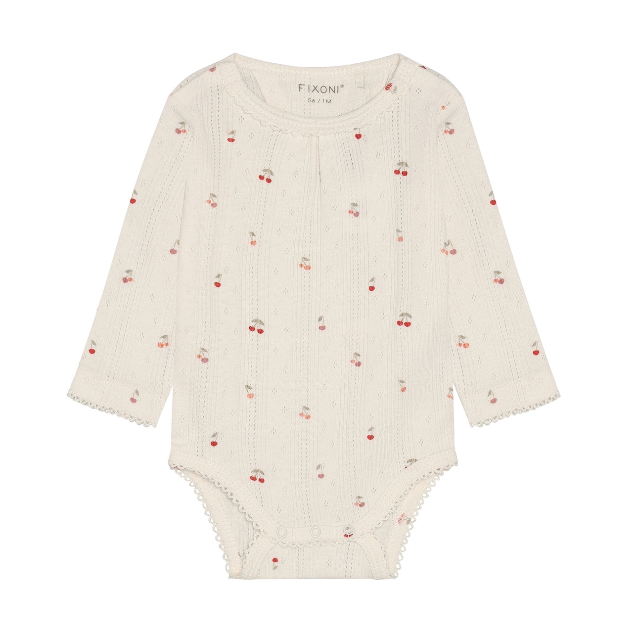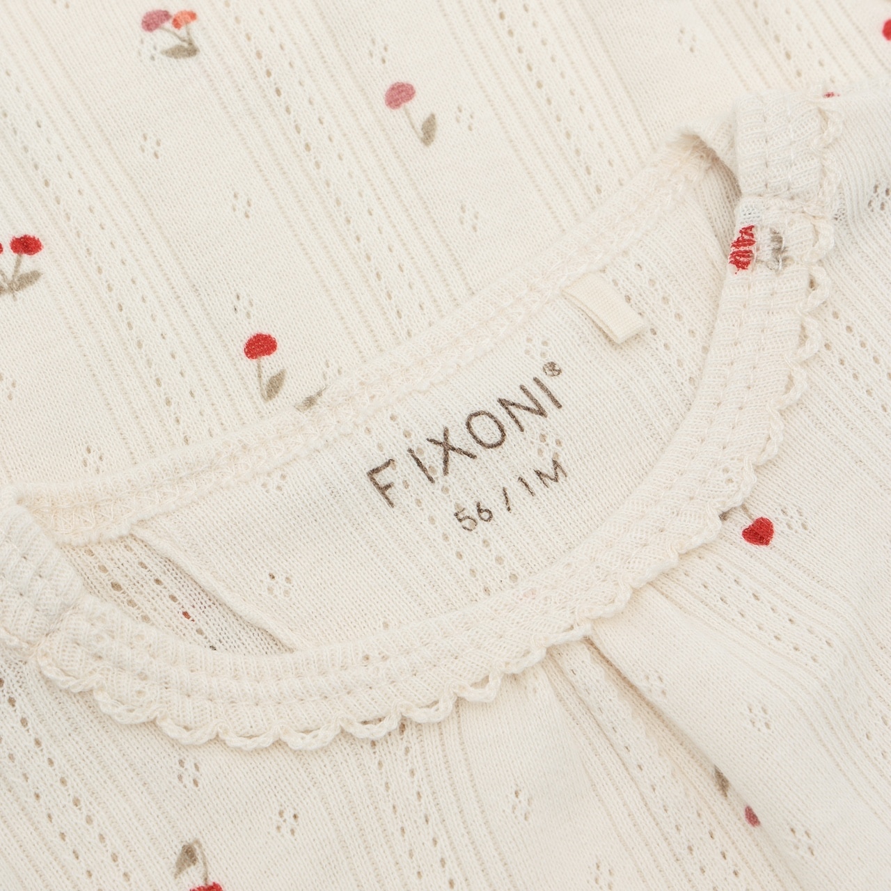 Fixoni Body LS Pointelle Eggnog. Lichaam gemaakt van pointelle van FIXONI. Het heeft een overal print en rimpelt zich aan de voorkant bij de hals. Het lichaam kan bij de nek en tussen de benen worden geopend. Gecertificeerd volgens GOTS – organisch