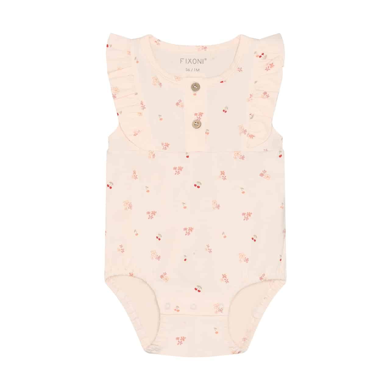 Fixoni Romper SS Dusty Rose. Romper van FIXONI. Het pak is volledig bedrukt en heeft een knoopsluiting aan de voorkant. Het jumpsuit heeft ruches op de schouders en geeft een vrouwelijke uitstraling. Gecertificeerd volgens GOTS – organisch