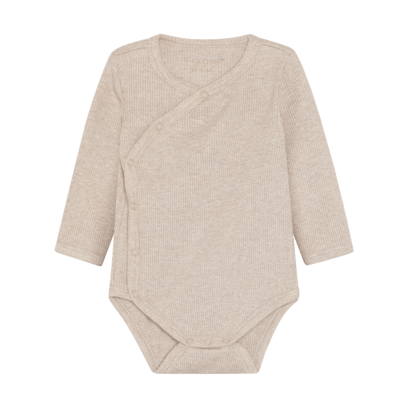 De Fixoni Wrap Body Melange Rib Pure Cashmere Melange met lange mouwen is een comfortabele en stijlvolle babybody met een praktisch wrap-around ontwerp. Dankzij de overslagsluiting hoef je de body niet over het hoofdje van je baby aan te trekken, wat het aan- en uitkleden extra makkelijk maakt — ideaal voor pasgeborenen.