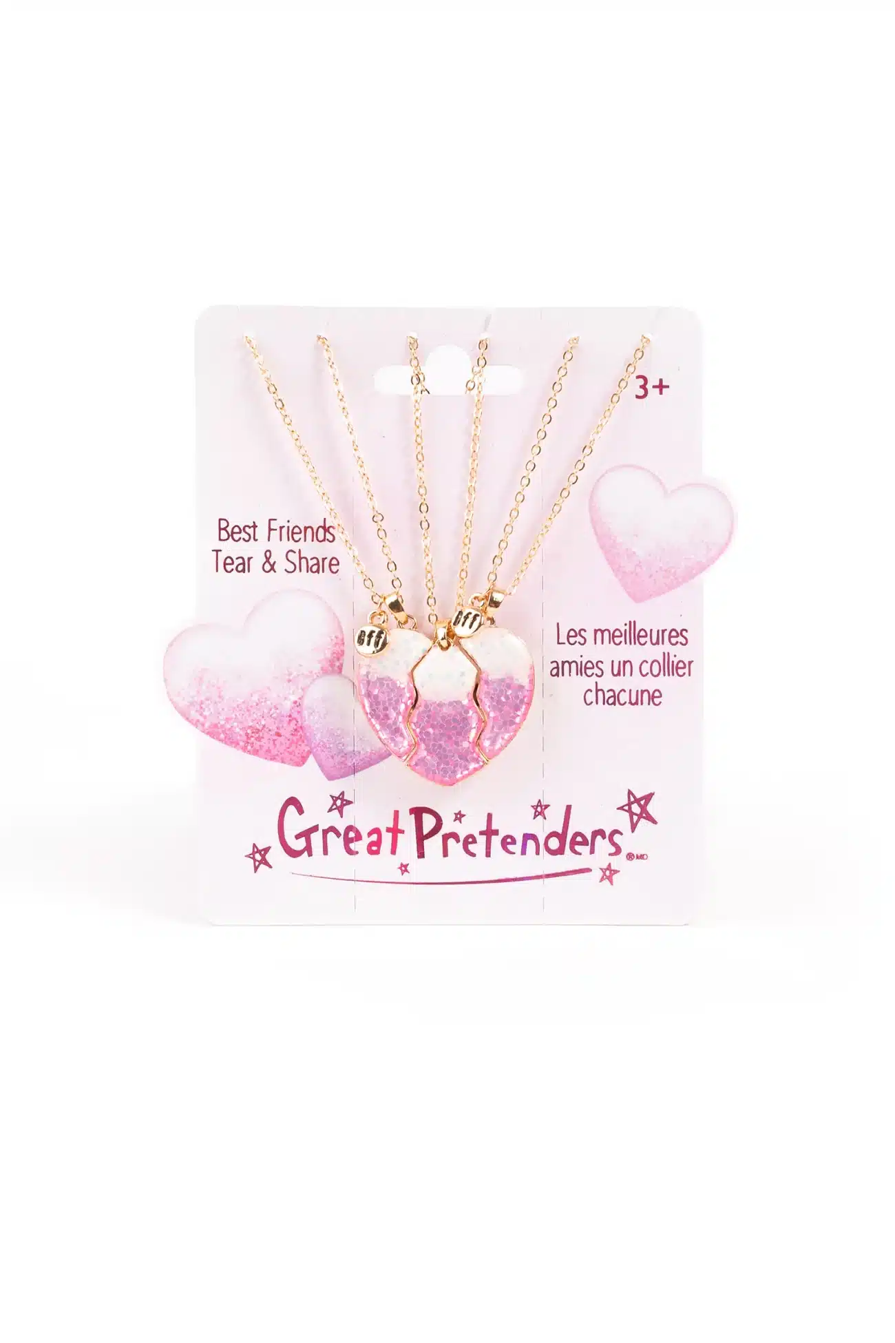Vier vriendschap met de Great Pretenders Besties Era Tear & Share Ketting! Deze vrolijke set bestaat uit drie gouden kettinkjes, elk met een sprankelend roze hartje. Het hart kan in drie losse delen worden gesplitst, zodat elke bestie haar eigen stukje van de magie draagt.
