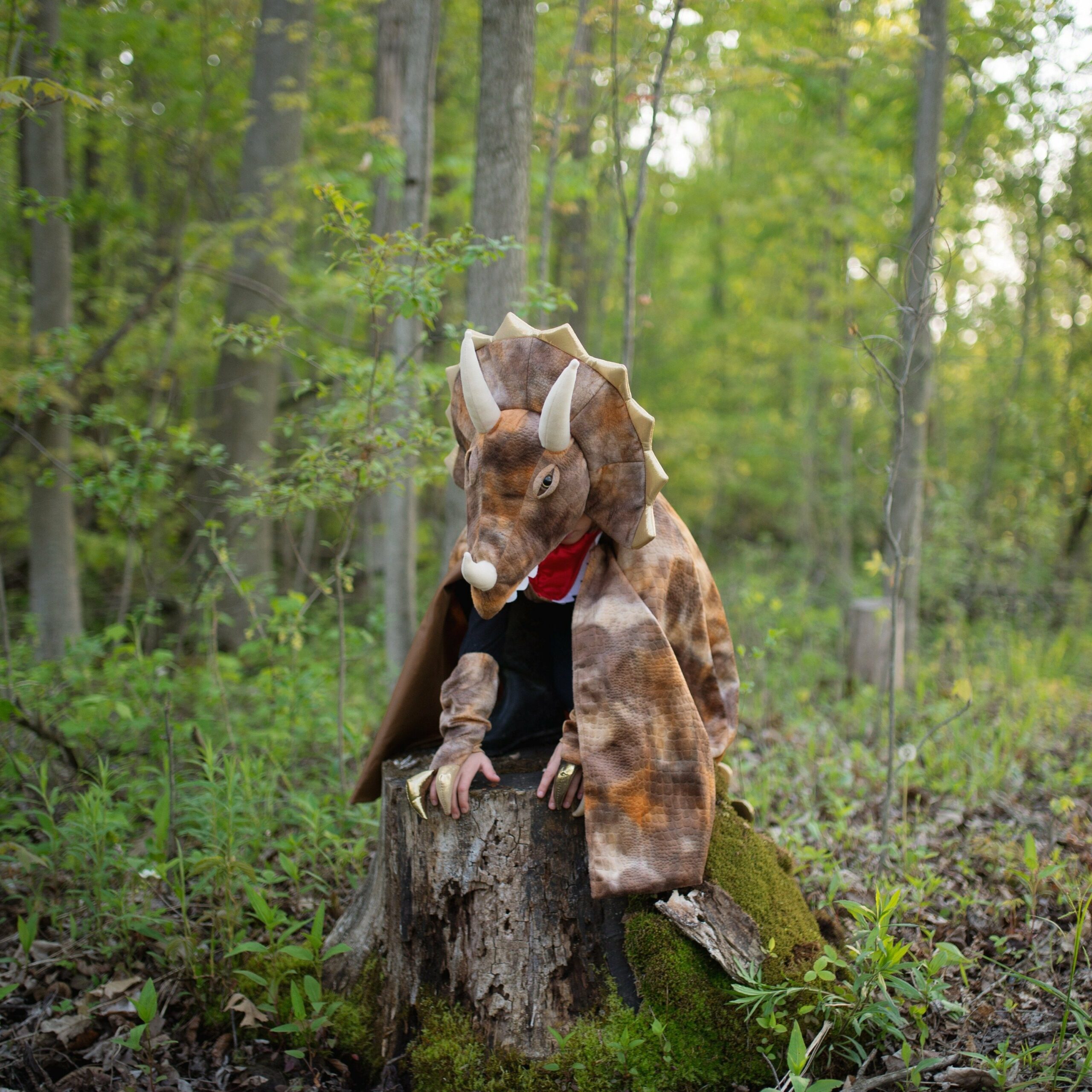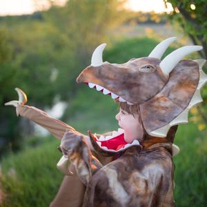 Great Pretenders Grandasaurus Triceratops Cape. Je kind zal dol zijn op deze superleuke, totaal monsterlijke dinosaurus cape! Deze handgeverfde cape in bruin, grijs en oranje is gemaakt met een rode en bruine voering. Gedetailleerd met opgezette gouden en bruine metalen spikes aan de achterkant. De dinosauruskop heeft een afneembaar mondstuk voor een goede pasvorm. Dit is een tweedelige set – inclusief cape en klauwen.