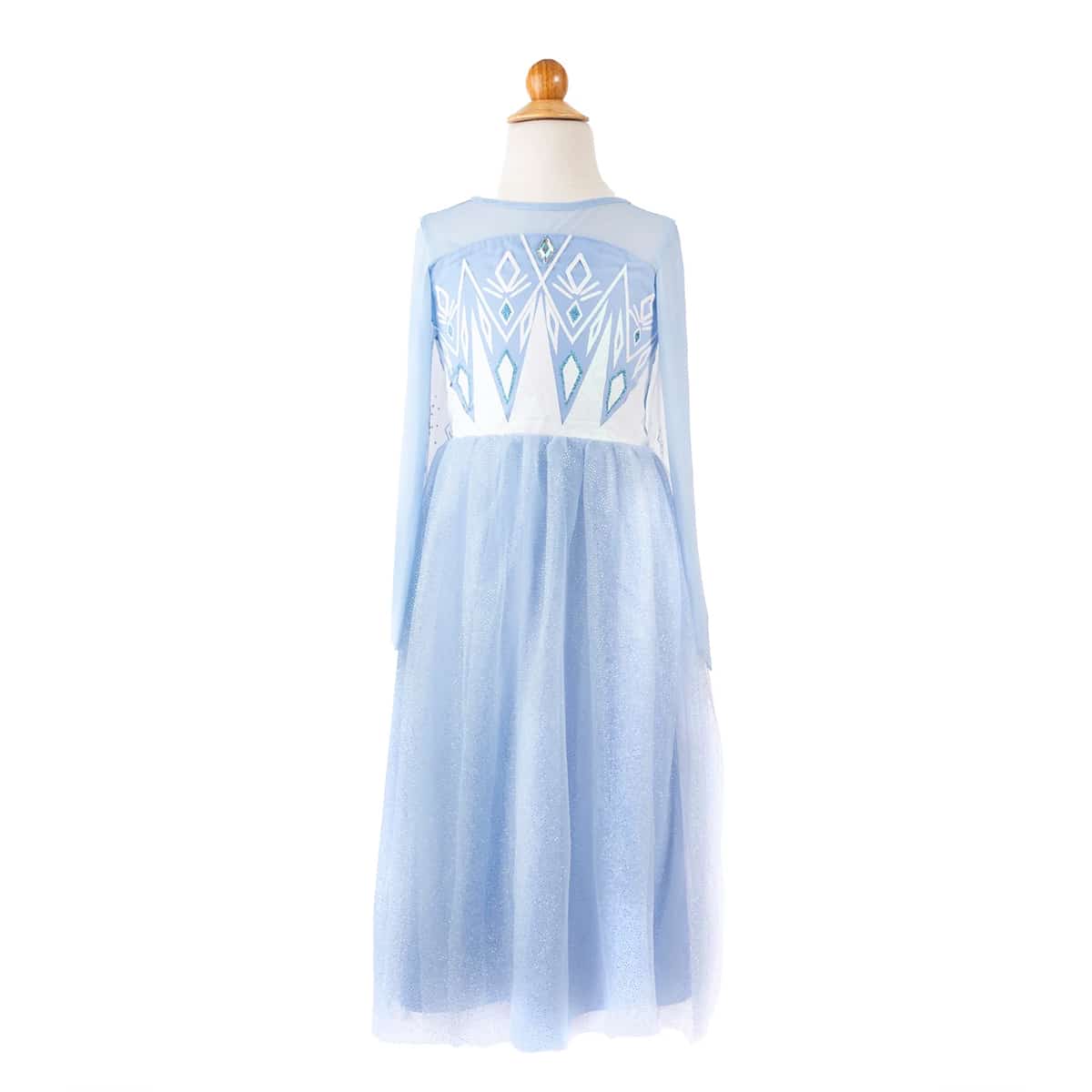 De rok van glinsterende blauwe tule vangt het licht bij elke draai en maakt van deze jurk een echte winterwonderjurk, perfect voor verkleedfeestjes, toneelvoorstellingen of fantasierijk spel.