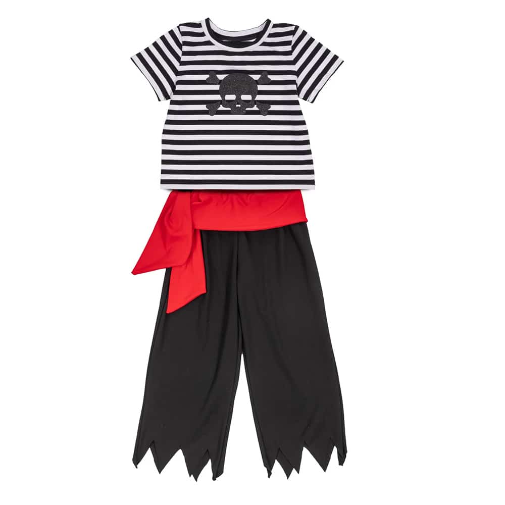 Het piratenshirt heeft klassieke zwart-witte strepen met een stoer doodshoofd-embleem op de borst — zo weet iedereen meteen wie de baas is op zee. De zwarte broek met ruige, rafelige onderkant geeft het kostuum die echte “net van het piratenschip gestapt” look.