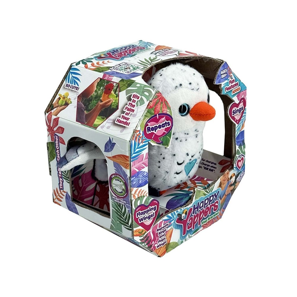 De Happy Yappers kunnen gesproken woorden en geluiden opnemen en herhalen met hun eigen lieve stem. Daarnaast zingen ze een vrolijk liedje en fladderen ze met hun vleugels. Tik zachtjes op het vogeltje en je hoort echte tjilpende geluidjes – perfect voor nieuwsgierige kinderen.