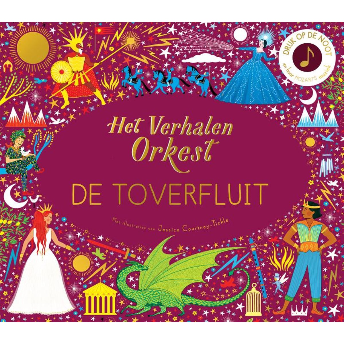 Het verhalenorkest: De Toverfluit. Laat je betoveren door Mozarts Die Zauberflöte. Volg prins Tamino op zijn zoektocht naar prinses Pamina. Kijk hoe hij ontsnapt aan een draak, ontkomt aan gevangenschap en iedereen verleidt met zijn toverfluit. Zal de prins samen met zijn prinses kunnen ontsnappen? De prachtige tekeningen van onder andere paleizen, prinsessen en draken komen extra tot leven als je op de muzieknoten in het boek drukt: je hoort fragmenten uit de opera! Aan het eind van het boek vind je uitleg over het muziekstuk met leuke weetjes over klassieke muziek.