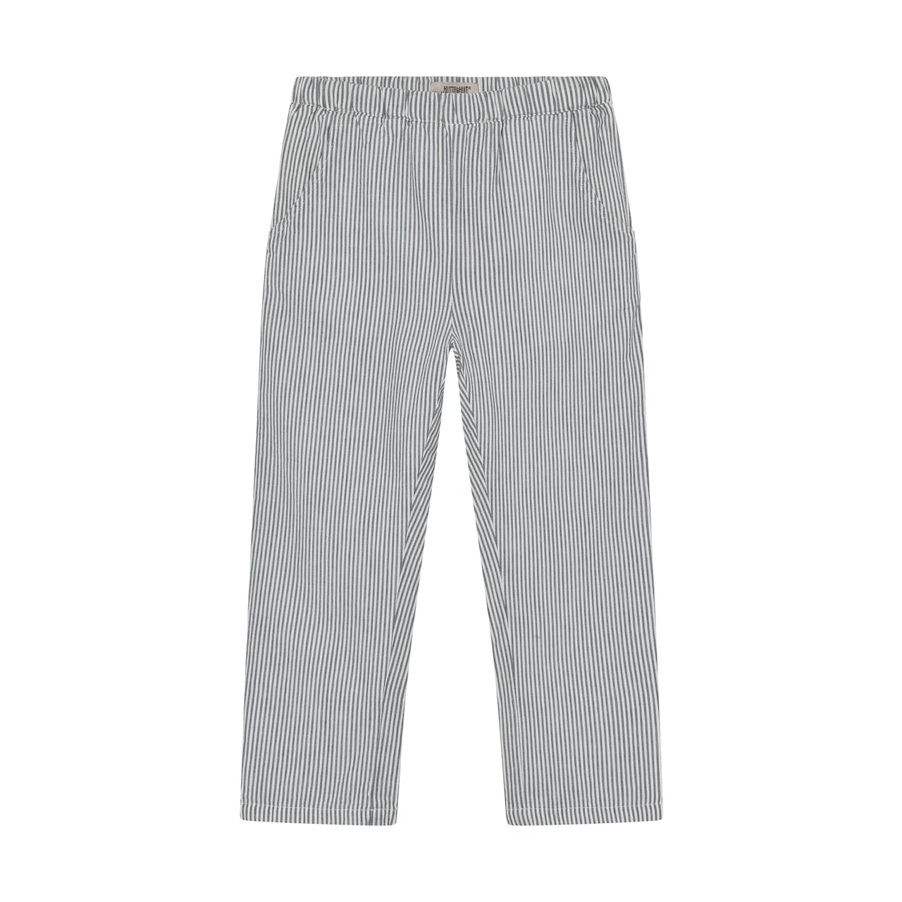 Huttelihut Pants YD stripe Bering Sea. Eenvoudige HUTTEliHUT-broek met verticale strepen. De broek heeft rechte pijpen, elastisch in de taille en een interne verstelbare taille. Zakken aan de zijkanten en ze zijn gemaakt van zacht katoen met een dunne voering, gecertificeerd volgens GOTS – biologisch
