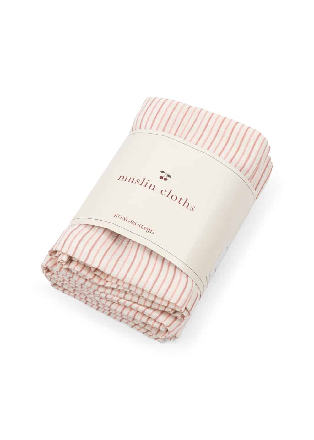 Konges Sløjd 3 Pack Muslin Cloth Gots Stripie Petite Rose. Zachte, multifunctionele mousselinen doeken gemaakt van 100% biologisch katoen. Keuze uit talrijke verschillende kleuren en kenmerkende prints.