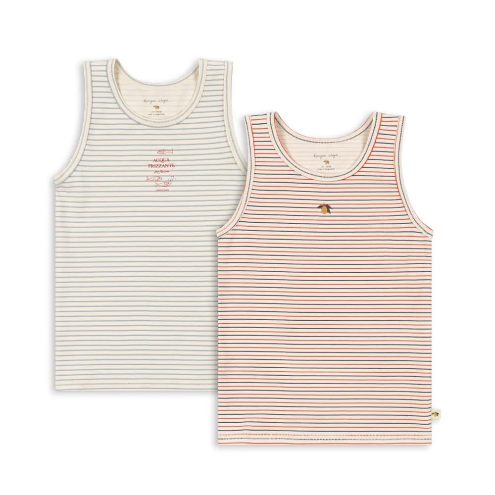 Konges Sløjd Basic 2 Pack Tank Tops Gots Stripe Bluie/Stripe Tricolore Petit. Zachte basic tanktops van een zachte biologische katoenkwaliteit met stretch voor een comfortabele pasvorm. Ideaal om alleen te dragen of als comfortabele en warme binnenlaag.