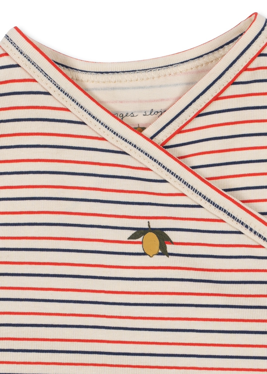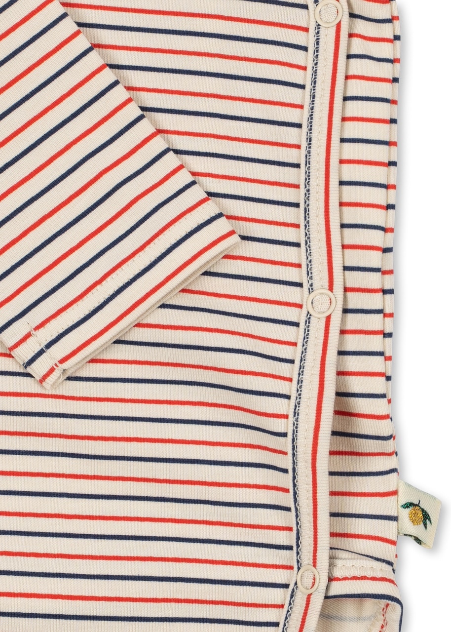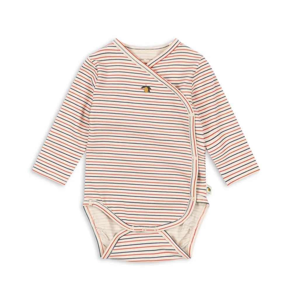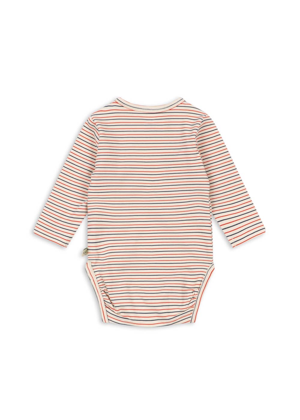 Konges Sløjd Basic Ls Newborn Body Gots Stripe Tricolore Petit. Zachte overslagromper met lange mouwen voor pasgeborenen, van biologisch katoen met een vleugje stretch voor een comfortabele pasvorm.