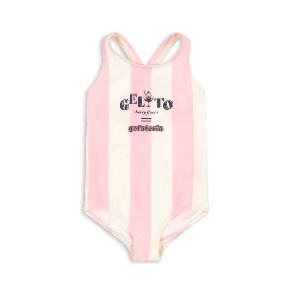 Konges Sløjd Pomia Swimsuit Grs Candy Rose Stripe. 82% RECYCLED POLYAMIDE 18% ELASTANE. This product contains at least 50% GRS-certified recycled polyamide, certified by CU 1094701; This product is OEKO-TEX® STANDARD 100, class 1 certified by DTI Tekstil, DTI 2276-361