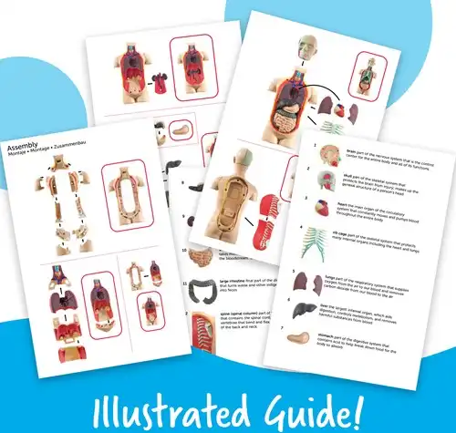 De set bevat onder andere de hersenen, schedel, hart, ribbenkast, longen, lever, maag, alvleesklier, nieren, darmen en wervelkolom. Met de duidelijke handleiding en feitengids ontdekken kinderen de functies van elk orgaan, terwijl ze hun fijne motoriek, concentratie en wetenschappelijke nieuwsgierigheid ontwikkelen.