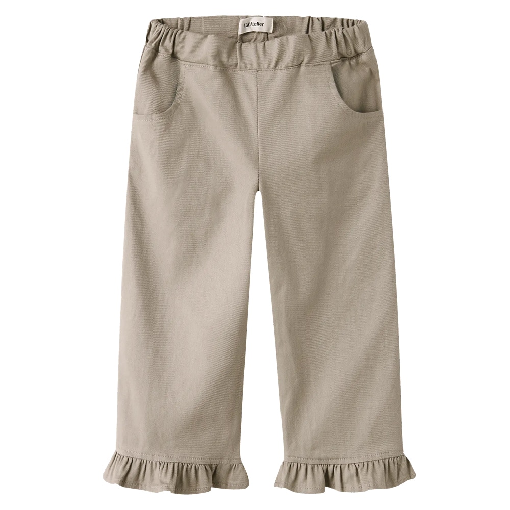 De geweven keperstof (twill weave) heeft een herkenbaar diagonaal patroon en geeft de broek een klassieke, tijdloze uitstraling. De brede beenpasvorm zorgt voor een trendy silhouet, terwijl de verstelbare taille een fijne, persoonlijke fit biedt. De voorzakken, kanten zomen en speelse ruches maken het ontwerp extra verfijnd en uniek.
