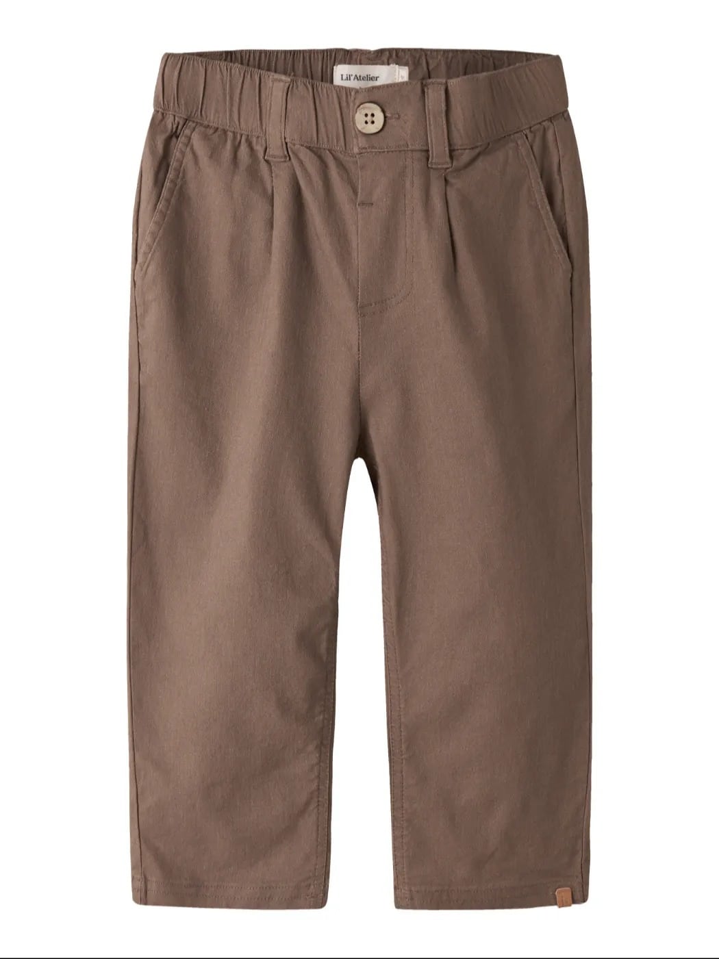 Lil’ Atelier Broek Shitake. Manufacture: Woven Manufacture Detail: Canvas Composition: 40% Viscose LENZINGâ„¢ECOVEROâ„¢, 31% Linen, 26% Cotton – Organic, 3% Elastane