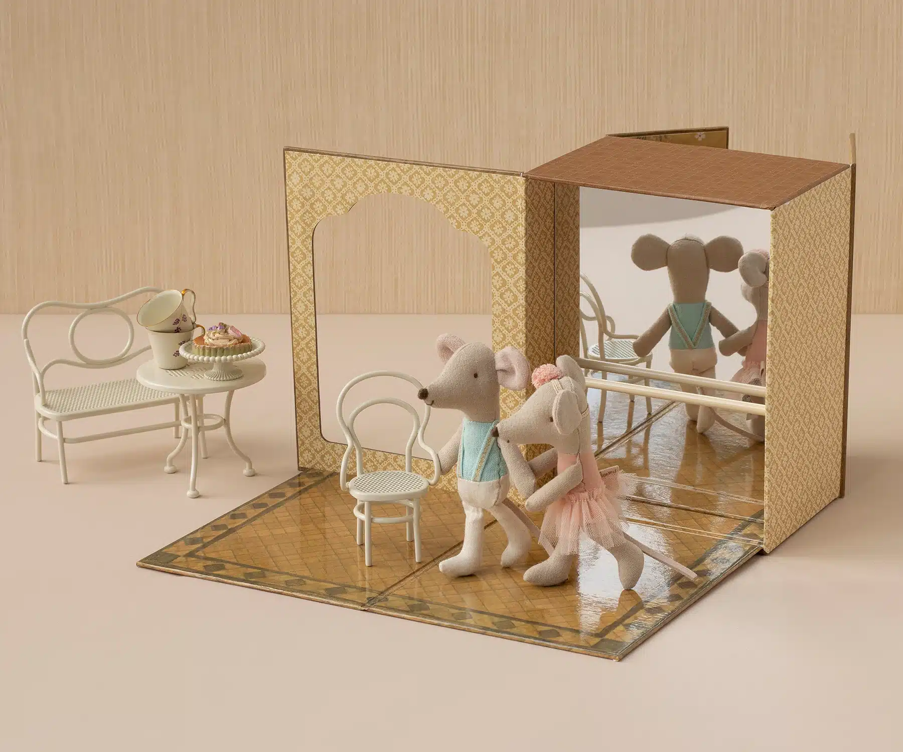 Maileg Ballet mice in dance studio, Little sister and brother.