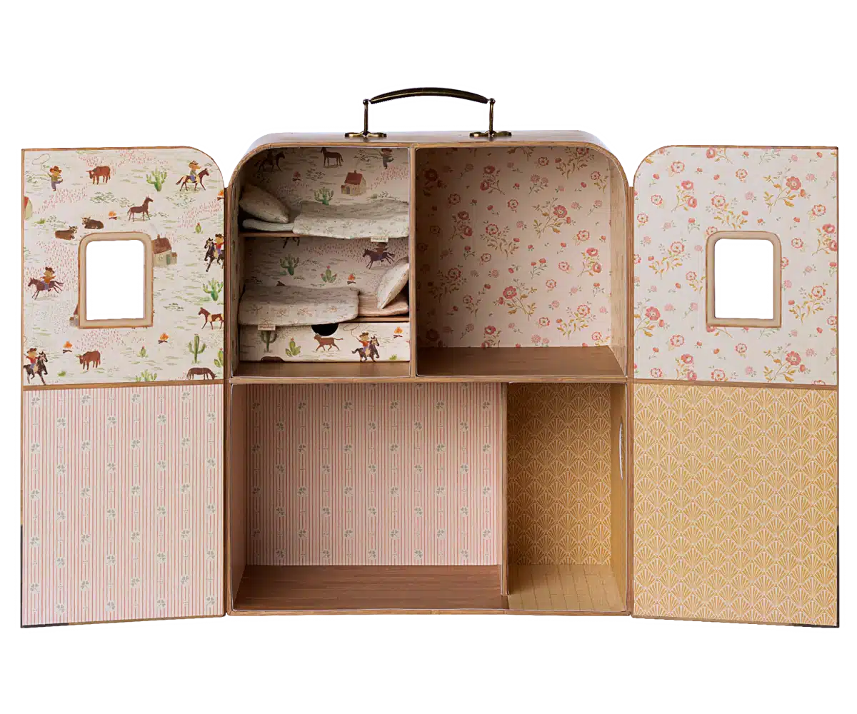 Maileg SuitCase, Little sister and brother mouse. Welkom bij SuitCasa – een klein draagbaar huis. Het past bij de grootte: kleine broertje en zusmuis. Twee sets zacht beddengoed voor je vrienden zijn inbegrepen, maar je kunt ook verschillende andere kleine meubels kopen om het huis te versieren.