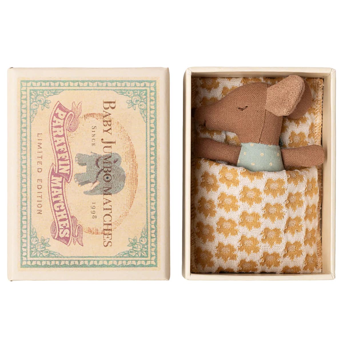 Maileg Sleepy wakey baby mouse in matchbox – Blue.