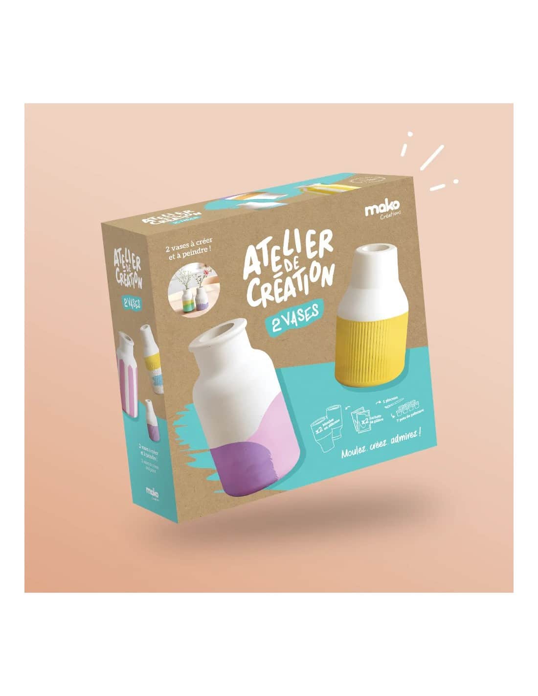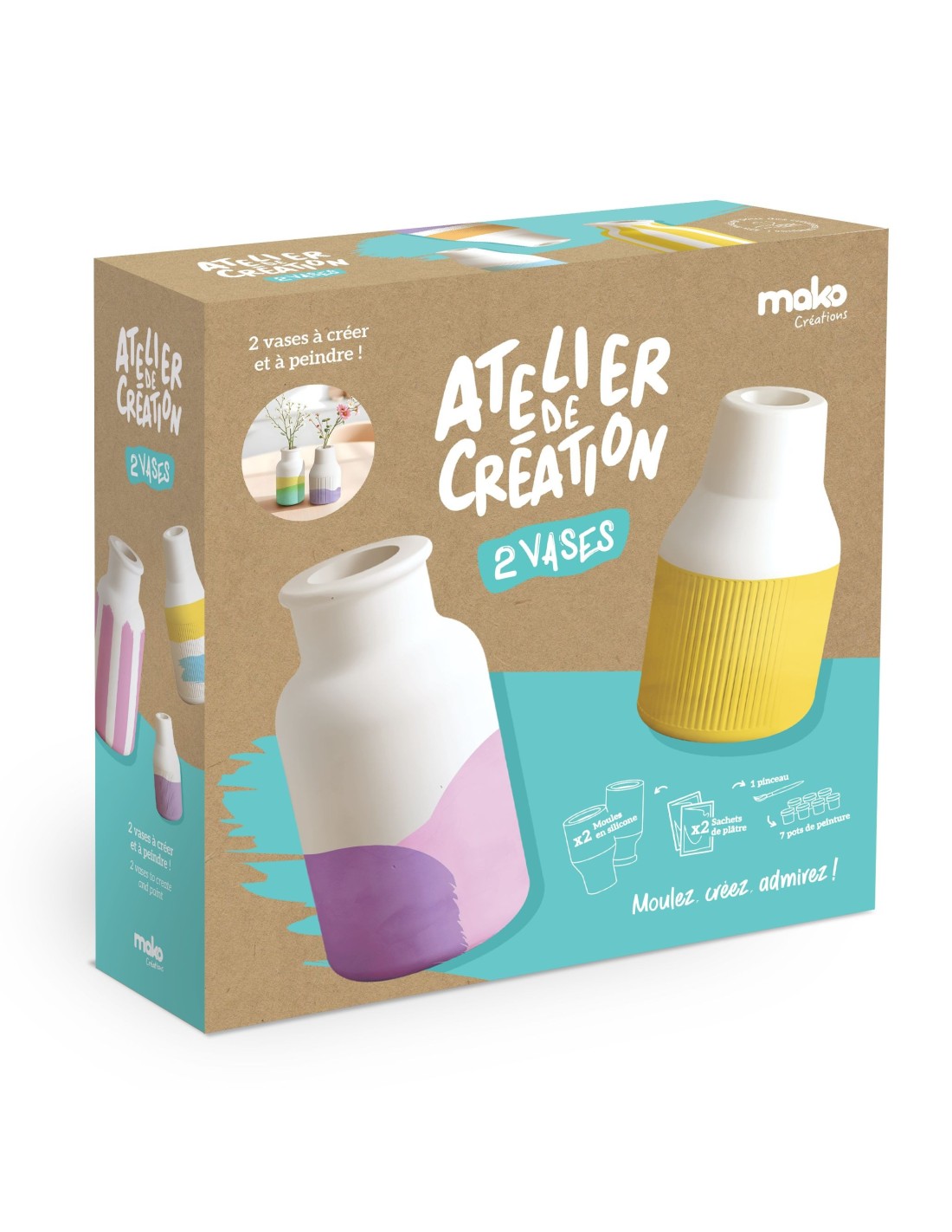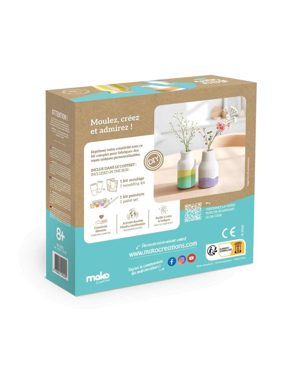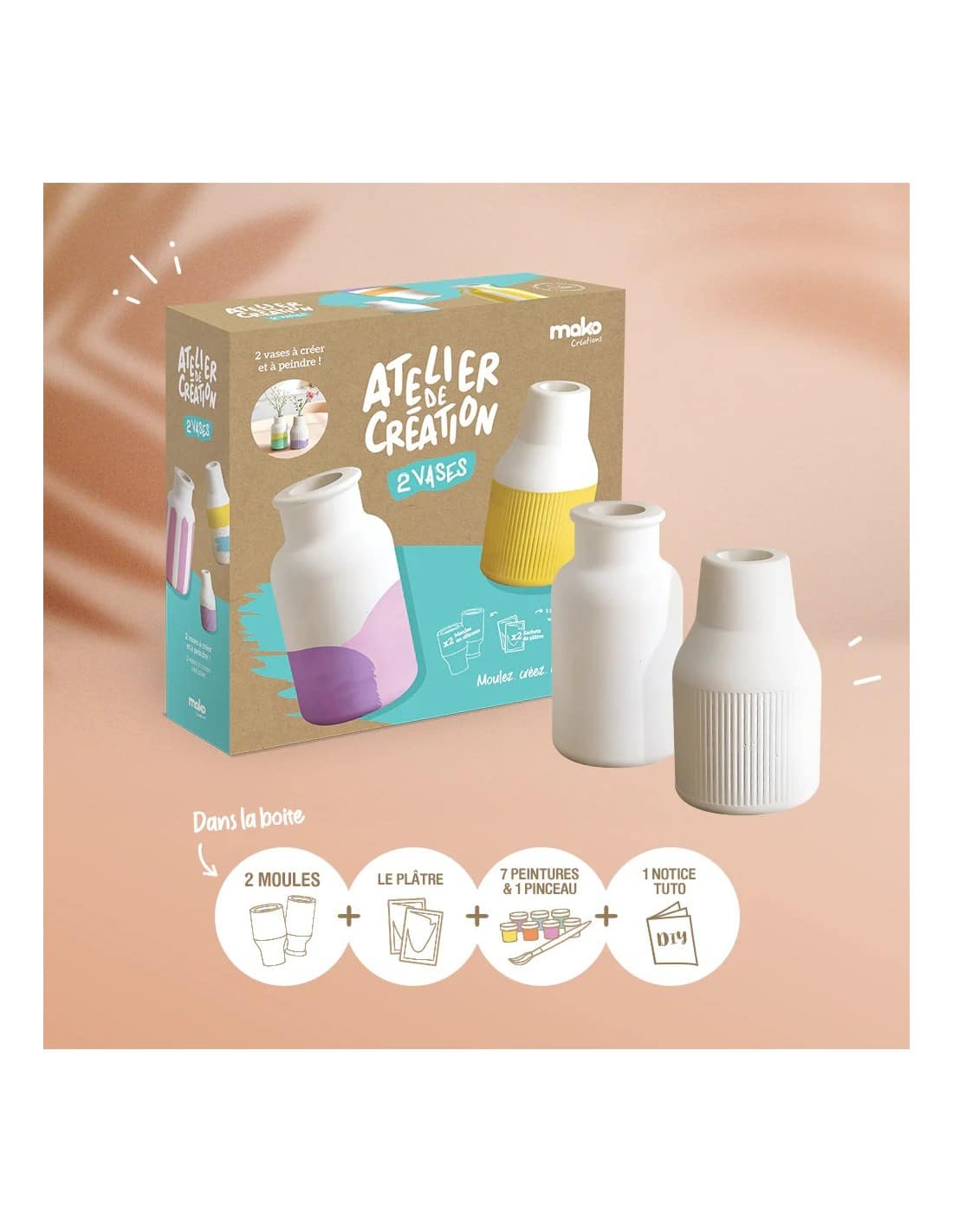 Mako Moulages – 2 vaasjes voor droogbloemen of pennen. ✓ 2 herbruikbare mallen voor 2 vaasjes om te maken en te beschilderen ✓ Sneldrogend in maximaal 45 minuten gewoon aan de lucht (geen oven of droger nodig) ✓ 2 zakjes sneldrogend gips van elk 300 g (600 g) ✓ 7 potjes gouacheverf op waterbasis (pastelroze, pastelpaars, pastelgeel, pasteloranje, pastelblauw, pastelturquoise, wit parelmoer) ✓ 1 kwast met houten handvat ✓ 1 handleiding met afbeeldingen