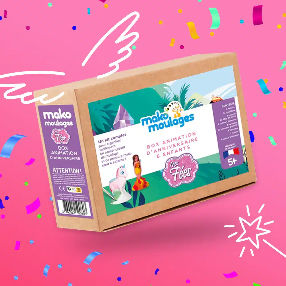 Mako Moulages – Verjaardagsbox voor 6 kinderen Feetjes. Verlevendig de verjaardag van uw kind met de Mako-verjaardagsanimatiebox met casts over feeën en eenhoorns! Met deze creatieve mako gegoten doos, op het favoriete thema van uw kind, kunnen alle kleine verjaardagsgasten hun eigen fee of eenhoorn in gips maken, door hun beeldje te vormen en vervolgens te beschilderen! Deze nieuwe kant-en-klare doos, speciaal ontworpen voor de animatie van een verjaardagsfeestje voor 6 kinderen, bevat alle benodigde apparatuur om gemakkelijk een dubbele activiteit van gieten en schilderen uit te voeren! Elke gast begeeft zich op een betoverde wereld en boetseert en schildert hun fee en eenhoorn! En hij kan ze versieren met prachtige parelmoer- en glitterverf! Jade, de aardefee is de bewaker van de fauna en flora, Alba, de luchtfee danst tussen de sterren, Luz, de vuurfee is bevriend met de zon en Marina, de waterfee beschermt de rivieren en zeeën. Hun vriend Mipou de eenhoorn is er altijd om fantastische avonturen met hen te beleven.