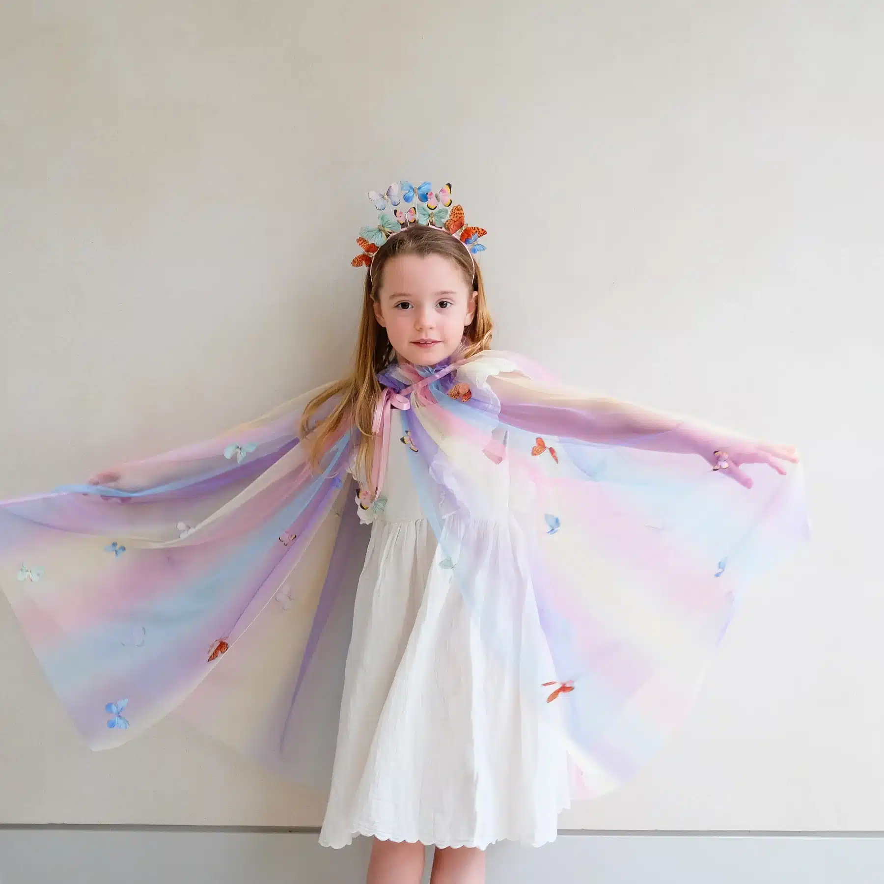 Mimi & Lula Butterfly Headdress. Laat hun verbeelding de lucht opslaan met Mimi en Lula’s dromerige nieuwe vlinderhoofdtooi! Versierd met fijne, gelaagde stoffen vlinders – perfect voor feestjes, verkleden of gewoon om wat magie toe te voegen aan gewone dagen! Waarom niet samenwerken met onze vlinderstok of cape voor de volledige look!