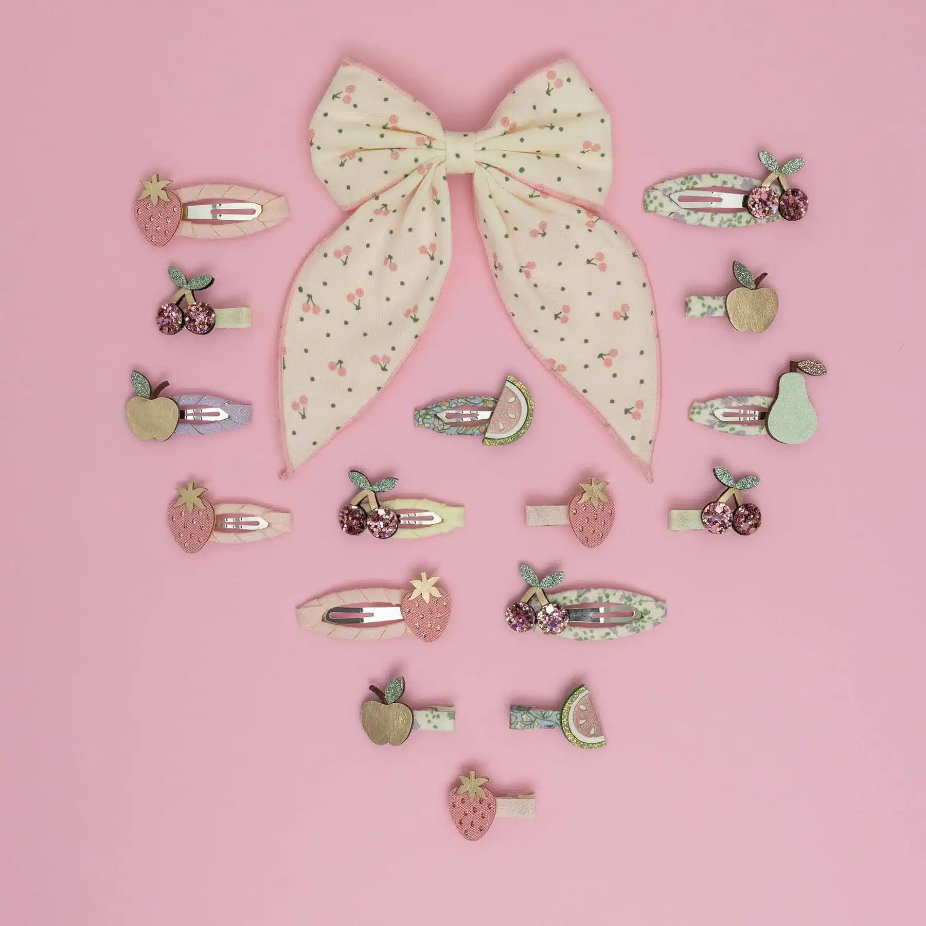 Mimi & Lula Cherry Print Bow. Deze prachtige nieuwe strik is gemaakt van een charmante kersenprint stof met zachte roze randen. De perfecte finishing touch voor elk kapsel!