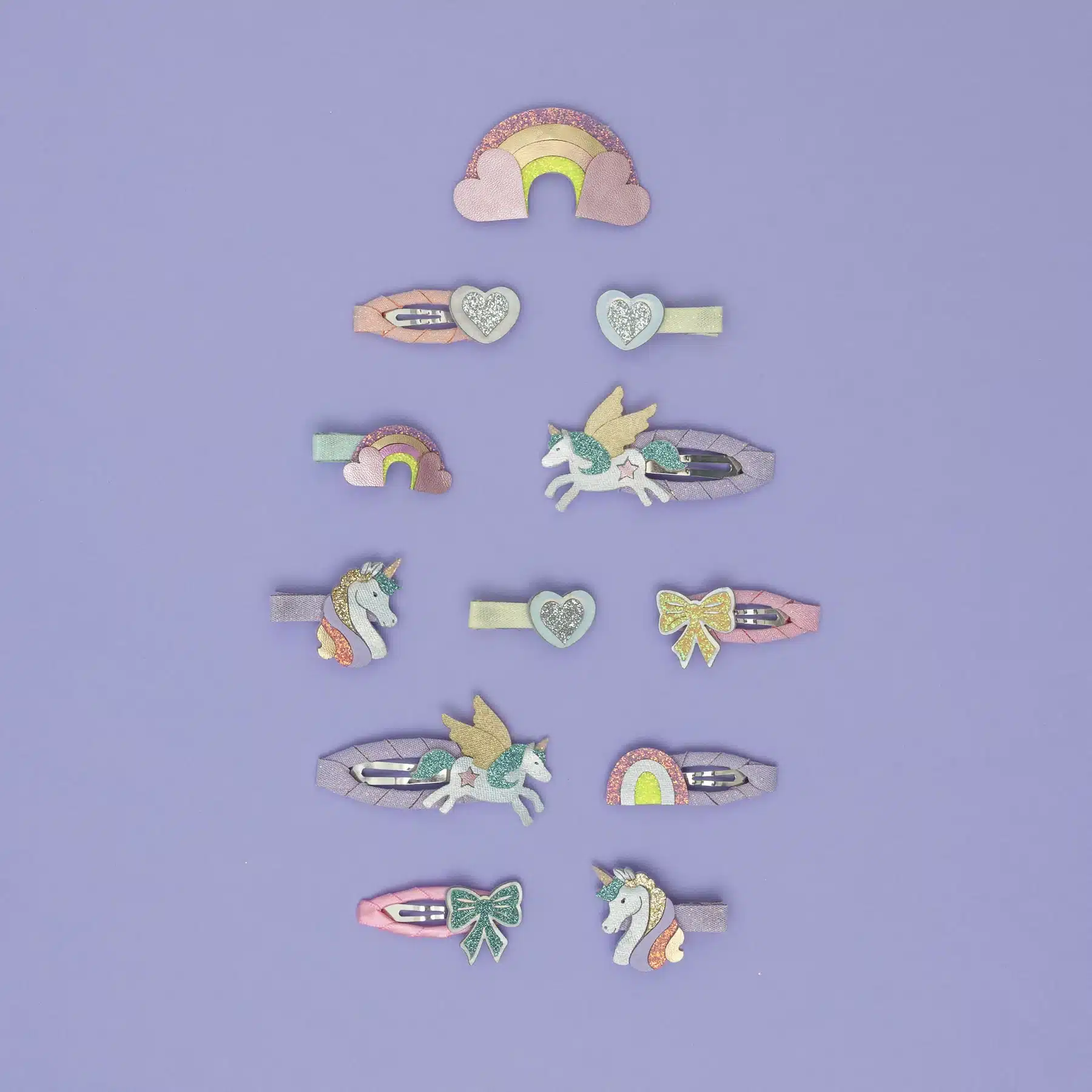Mimi & Lula My Little Unicorn Clic Clacs. 4 in a pack 5cm ribbon wrapped hair clips adorned with two majestic flying unicorns complete with glitter wings and two shooting stars in a rainbow of pastel colours