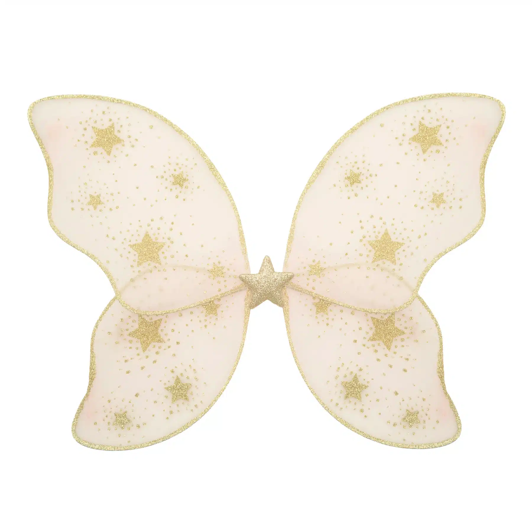 Mimi & Lula New Starry Night Wings – Pink. Soft pink netted fabric embellished with gold glitter star print Padded gold glitter central star with matching gold glitter edging Wings measure approx H40cm x W50cm Elasticated straps Wipe clean only Safety tested