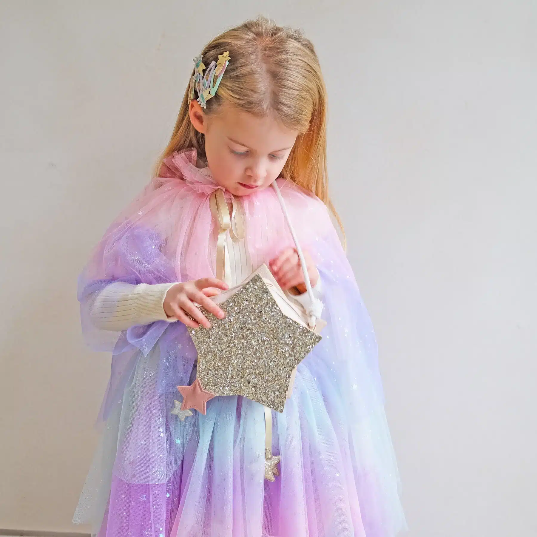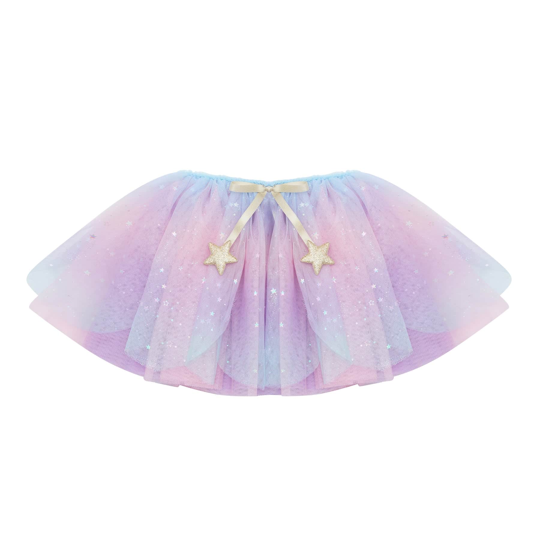 Mimi & Lula Scallop Pastel Tutu. Sized to fit ages 3-10 years Layers of pastel coloured rainbow tulle embellished with a holographic star print Elasticated waistband measuring approx 52cm wide Gold satin ribbon bow with gold glitter star charms Approx 28cm in length Wipe clean only Safety tested