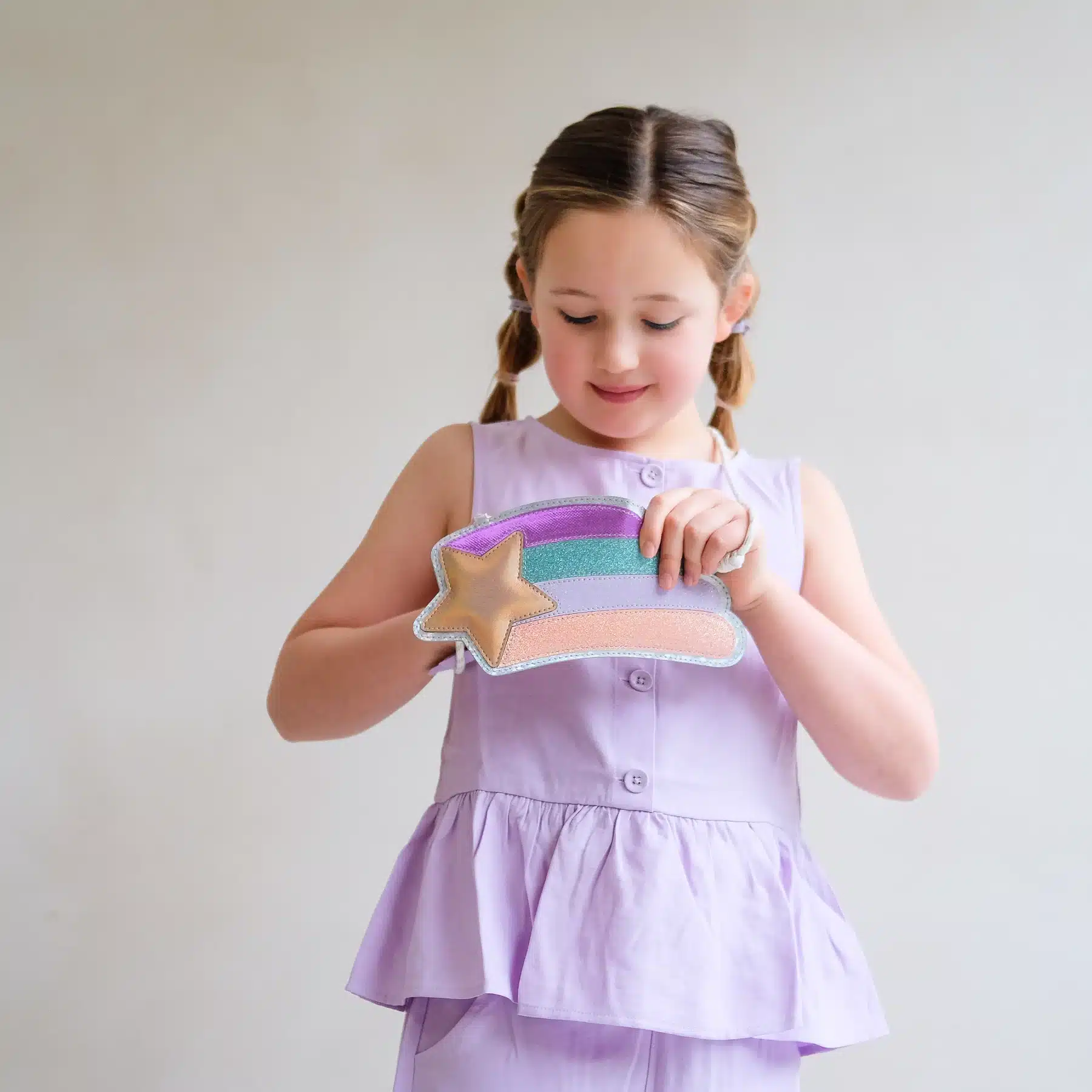 Met het handige ritsvak blijven alle spulletjes veilig opgeborgen. De verstelbare bungee schouderband met een zachte metallic ster zorgt voor extra comfort én een speels detail.