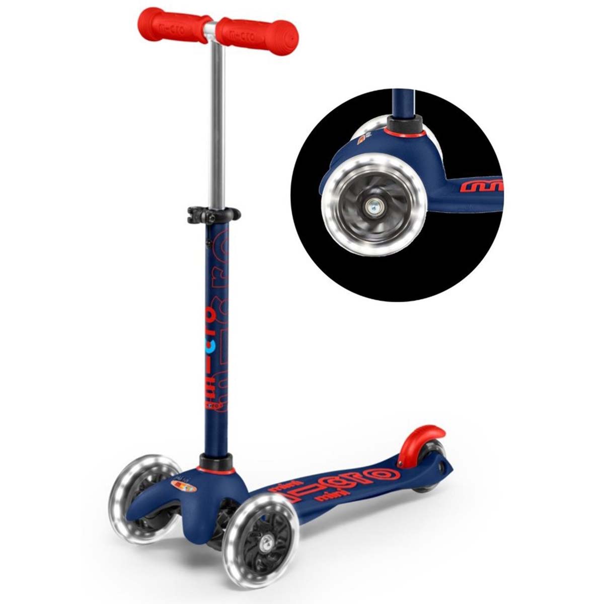 Deze Marineblauwe Mini Micro Deluxe LED met Rode letters is extra veilig door zijn witte LED lampjes, zodat je kind ’s avonds beter zichtbaar is. Kinderen vinden de LED wielen bovendien geweldig. Ze worden door beweging geactiveerd en lichten wit op. In het donker krijgt het hele wiel hierdoor een wit schijnsel. Beste is om dit klanten te laten zien in een donkere ruimte.
