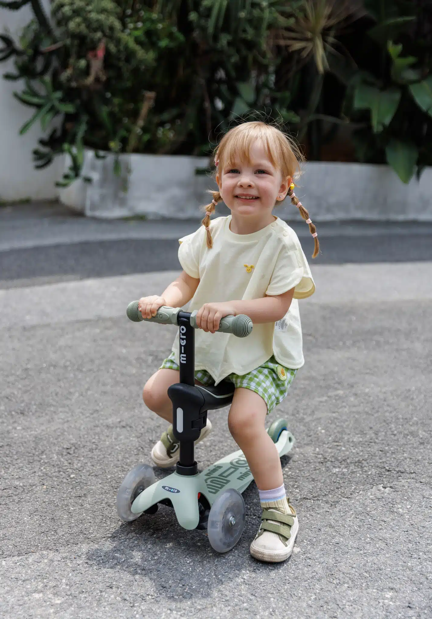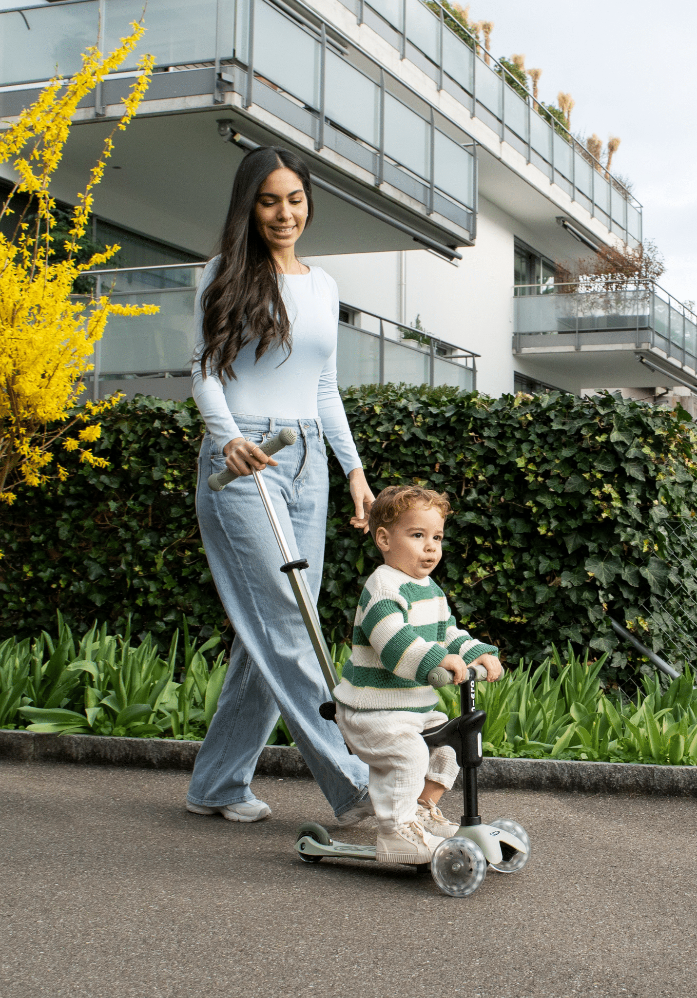 Eerst met het zitje en de duwstang (voor de allerkleinsten die nog niet zelf kunnen sturen).