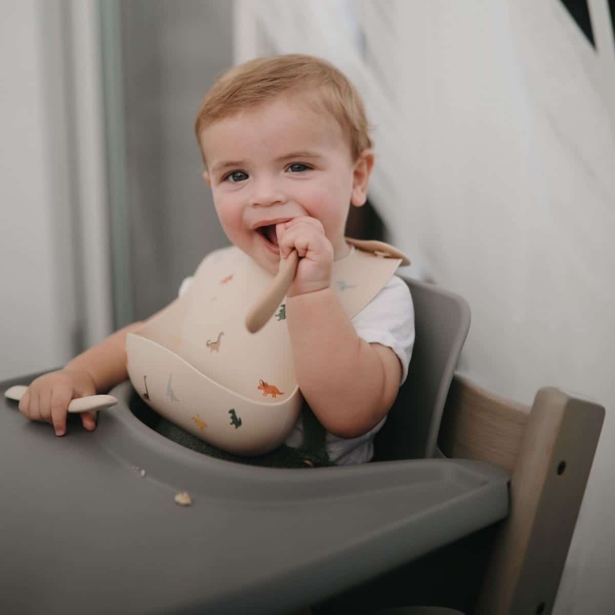 Mushie Slab Dino. Een siliconen slabbetje houdt je kleintje en de omgeving schoon: Â De diepe zak vangt het eten op en voorkomt dat het een puinhoop maakt op de vloer en op de kleren van de baby. De afgeronde, ingebouwde neksluitingen zorgen voor een comfortabele pasvorm.