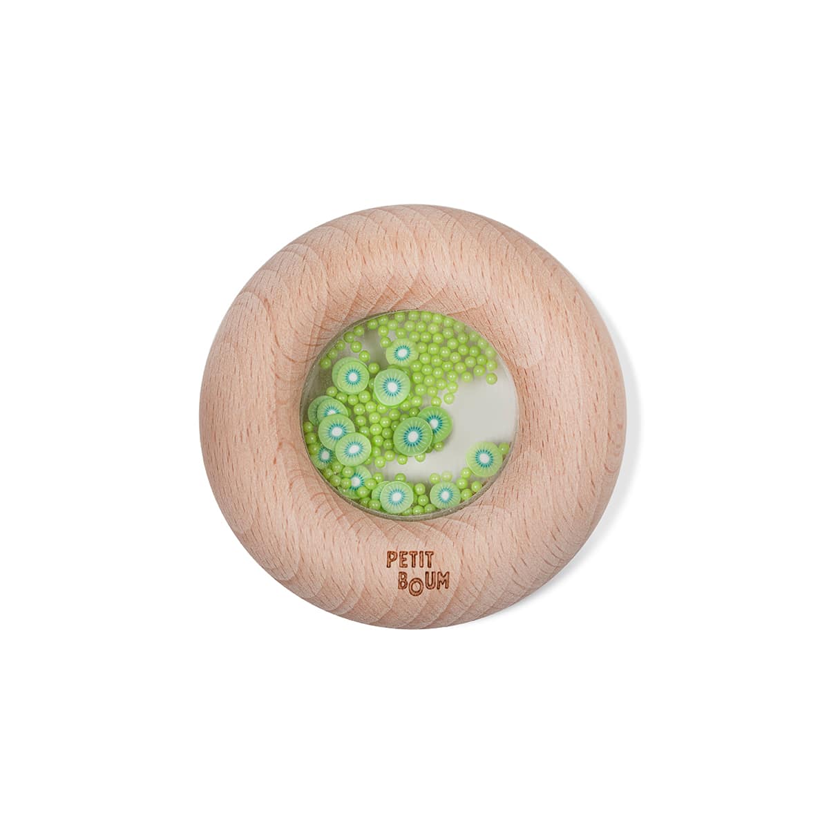 Petit Boum – Sensorische Donut- Kiwi. Laat je kindje spelenderwijs ontdekken met de Petit Boum Sensorische Donut – Aardbei! Deze houten rammelaar in de vorm van een donut is perfect om comfortabel vast te houden en stimuleert de zintuigen van je kleintje vanaf 6 maanden.