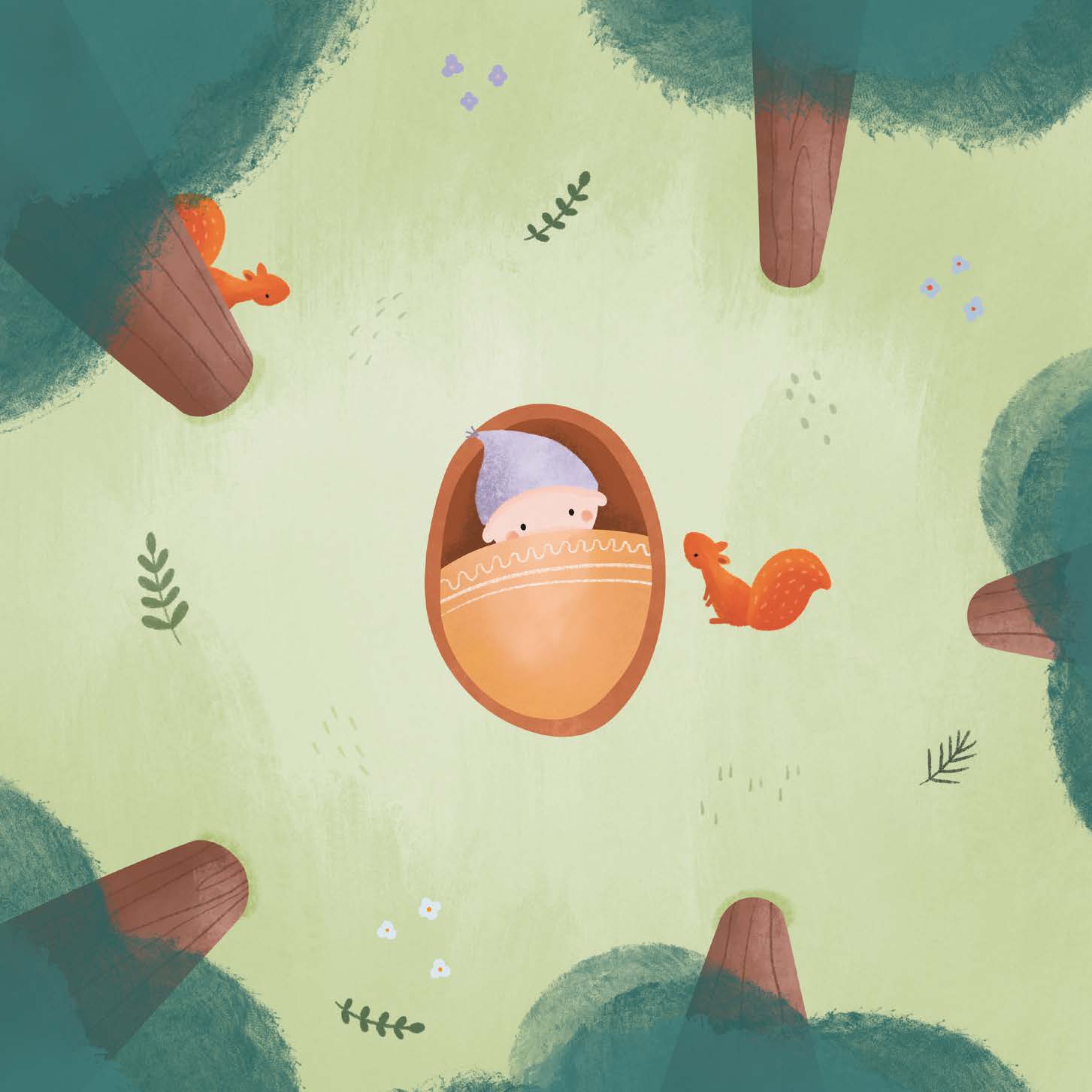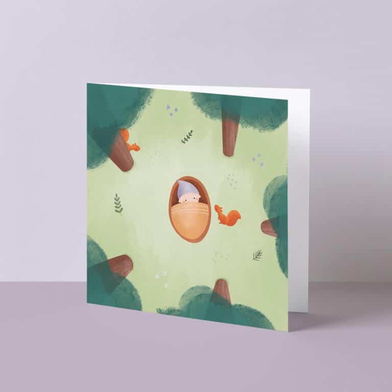Hoera, een kindje geboren! Op deze lieve geboortekaart komen twee nieuwsgierige eekhoorntjes voorzichtig kijken bij dit kleine wonder. Een zacht en sfeervol kaartje om de komst van een baby te vieren.