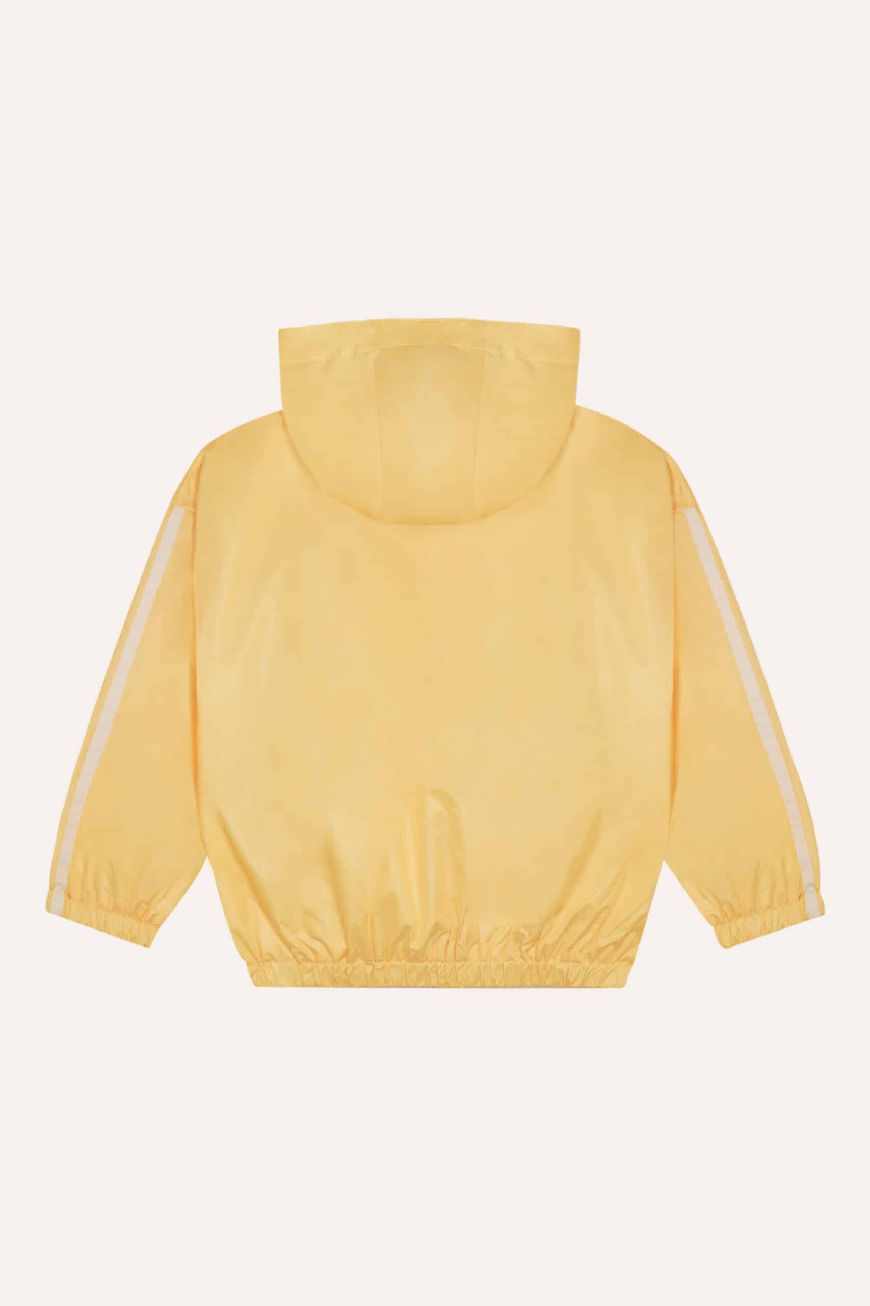 Het jack is gemaakt van gerecycled polyester, een bewuste keuze die duurzaamheid combineert met functionaliteit. Aan de voorkant sluit het jasje met een rits en de afneembare capuchon maakt het extra praktisch — ideaal voor wisselvallig zomerweer.