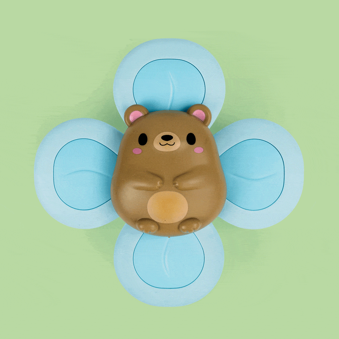 De vrolijke beer heeft vier draaiende bladen die uitnodigen om te grijpen, voelen, rammelen, kauwen en natuurlijk… draaien! Dankzij de sterke zuignap blijft het speeltje stevig vastzitten op gladde oppervlakken zoals badkuipen, tegels, kinderstoelen, spiegels, koelkasten of autoramen — ideaal voor spelen thuis of onderweg.