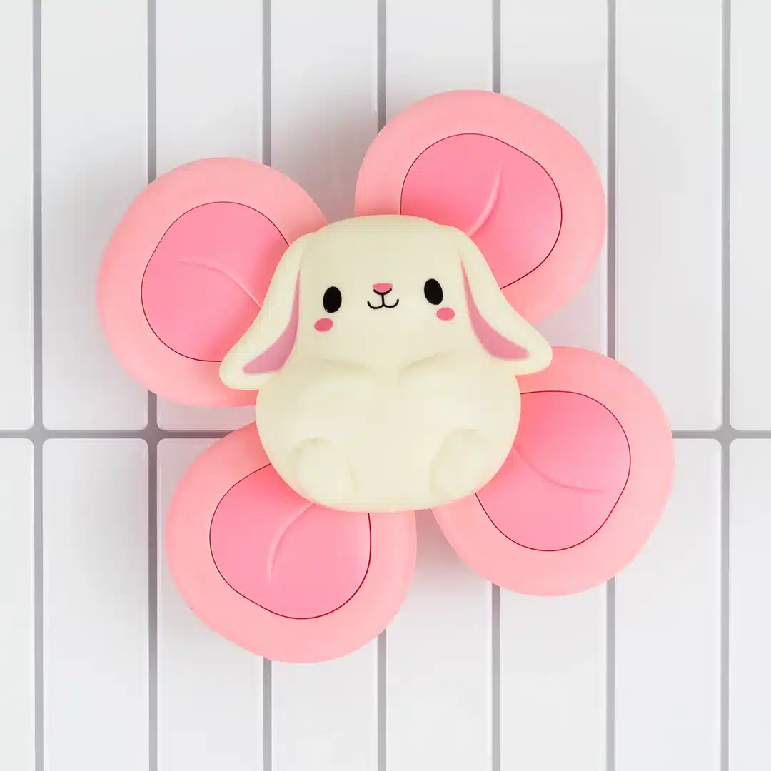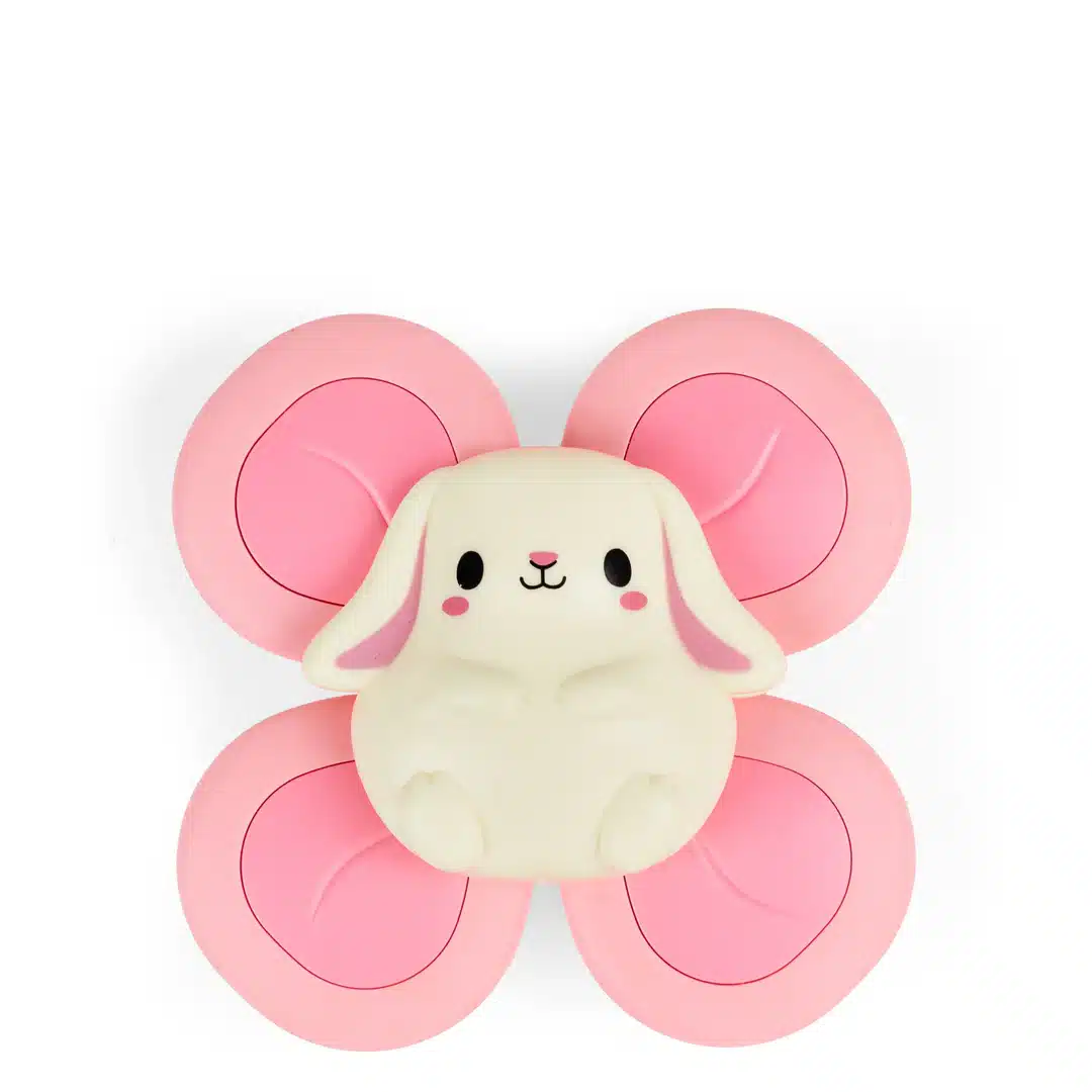 De vrolijke beer heeft vier draaiende bladen die uitnodigen om te grijpen, voelen, rammelen, kauwen en natuurlijk… draaien! Dankzij de sterke zuignap blijft het speeltje stevig vastzitten op gladde oppervlakken zoals badkuipen, tegels, kinderstoelen, spiegels, koelkasten of autoramen — ideaal voor spelen thuis of onderweg.